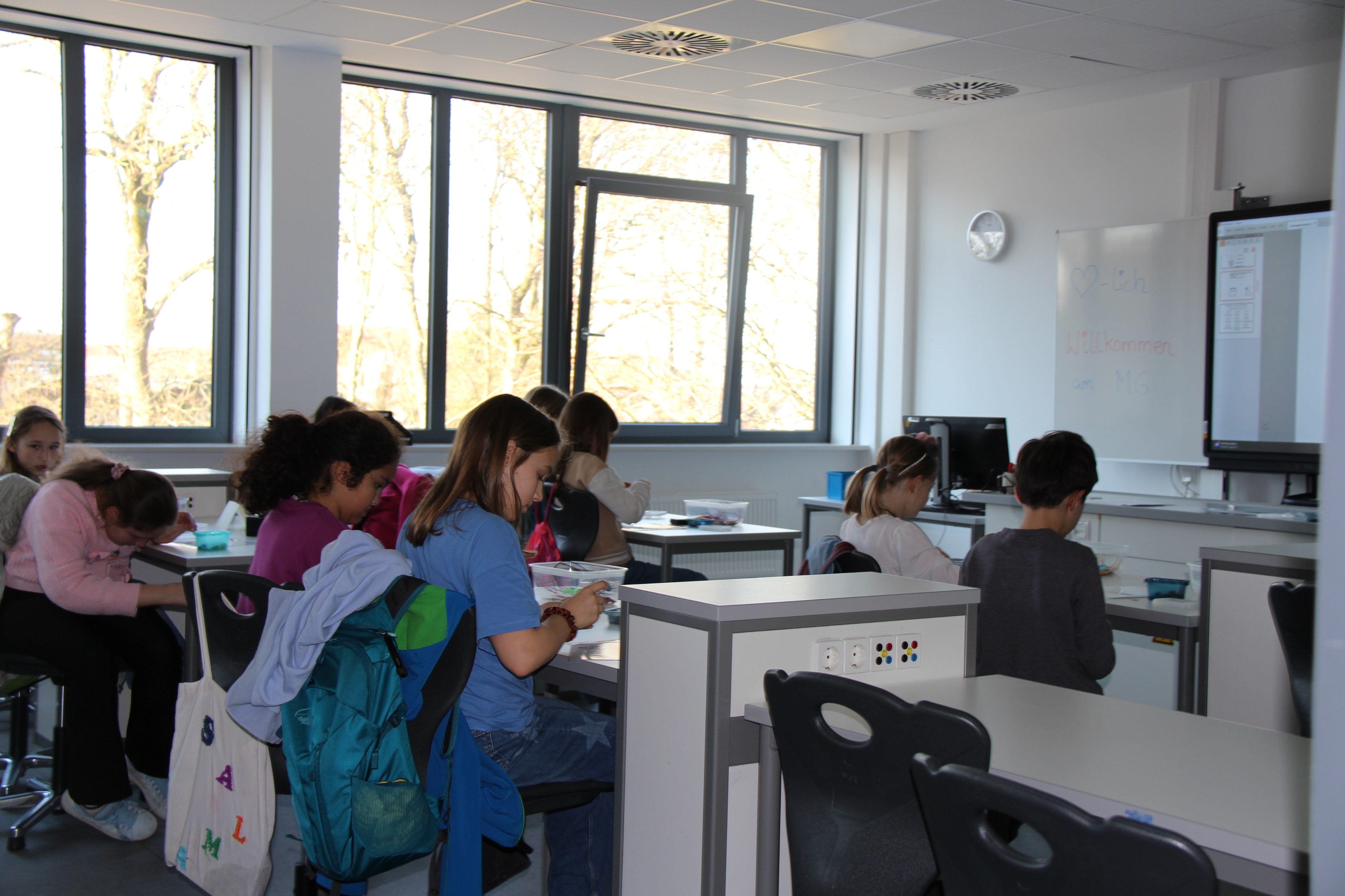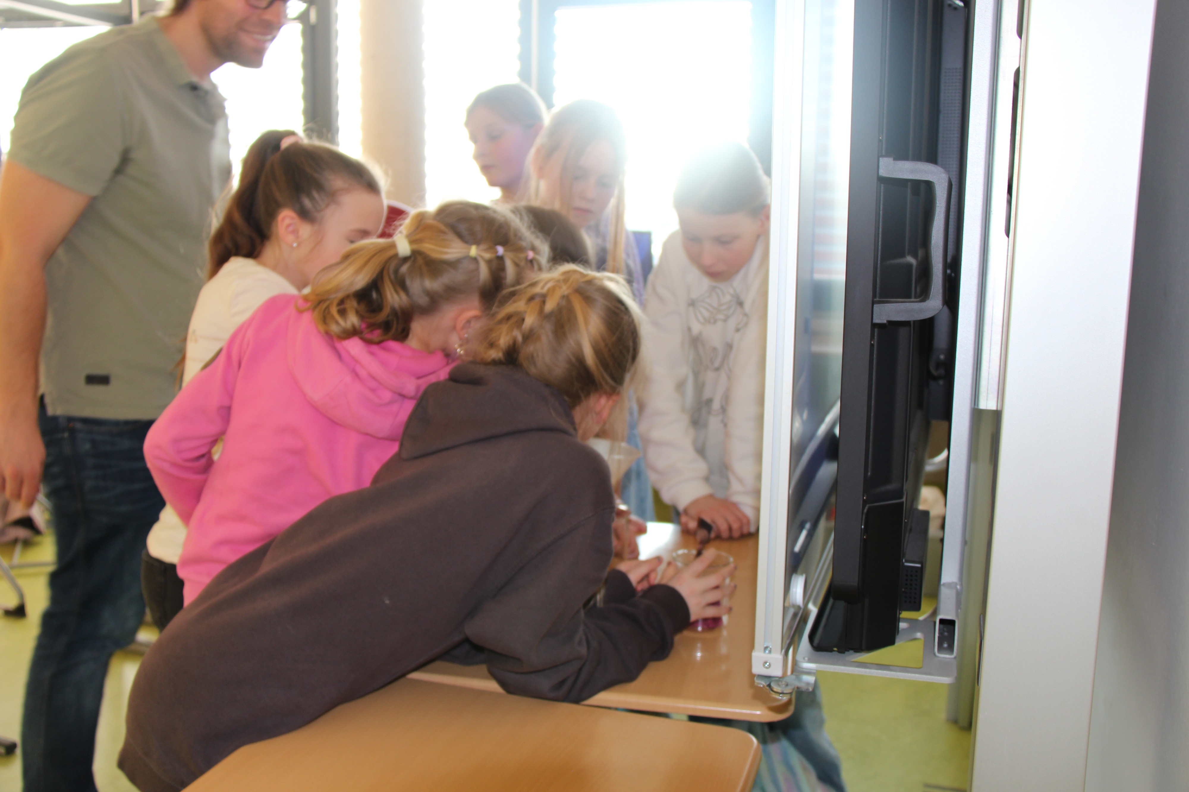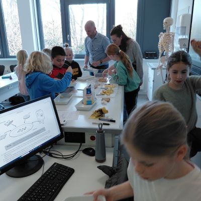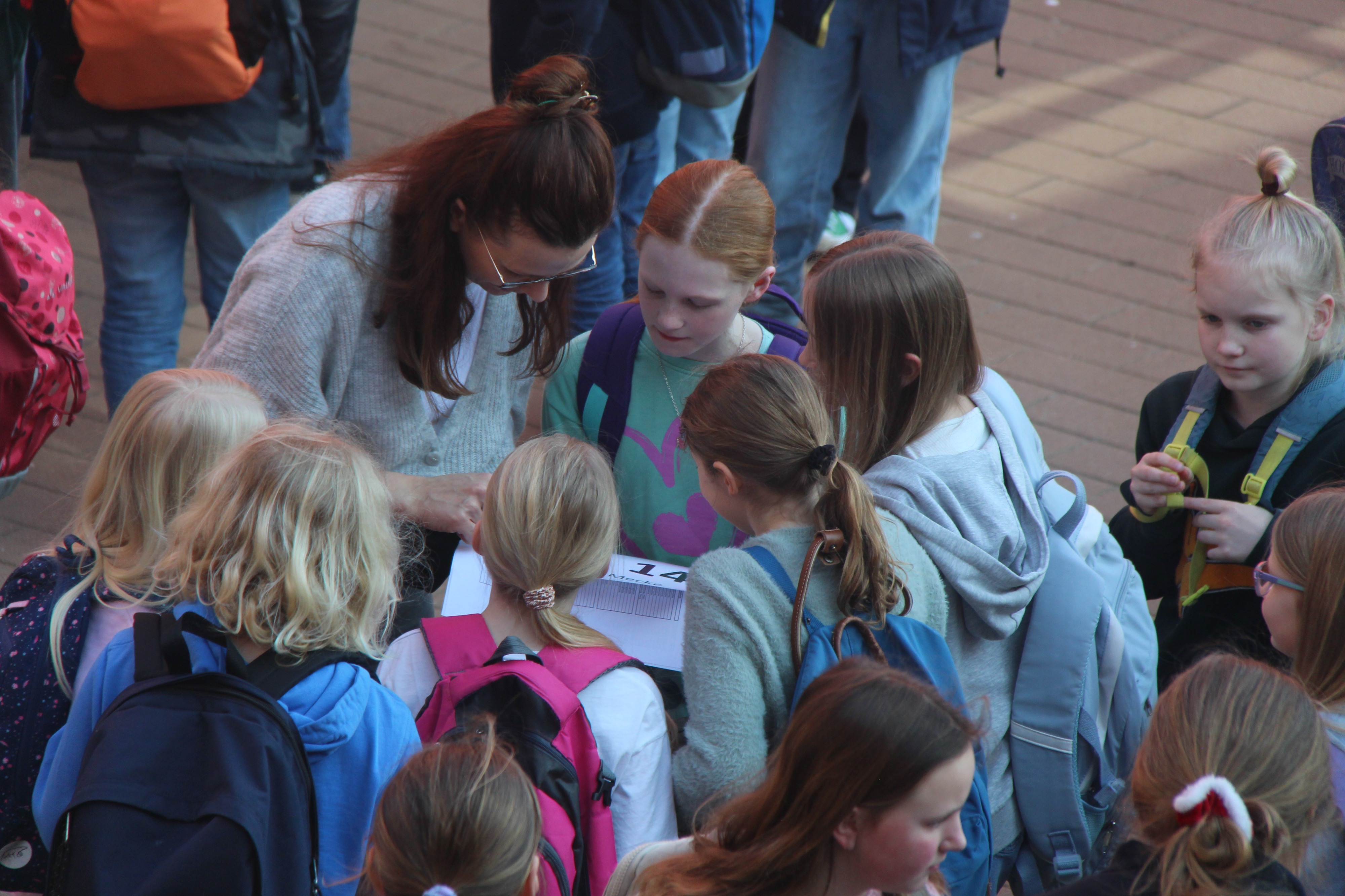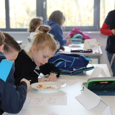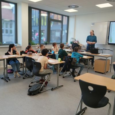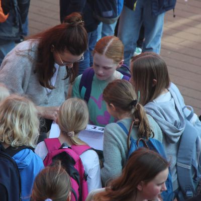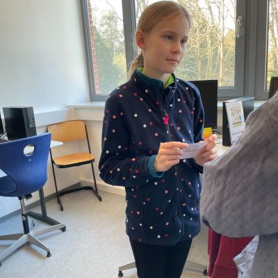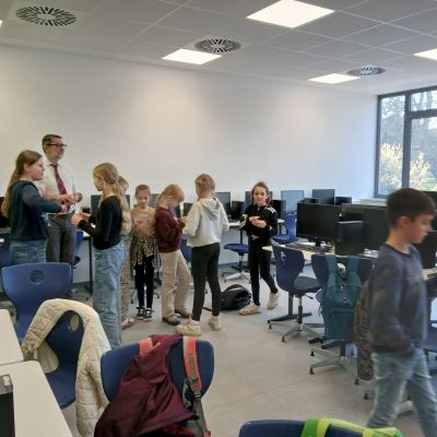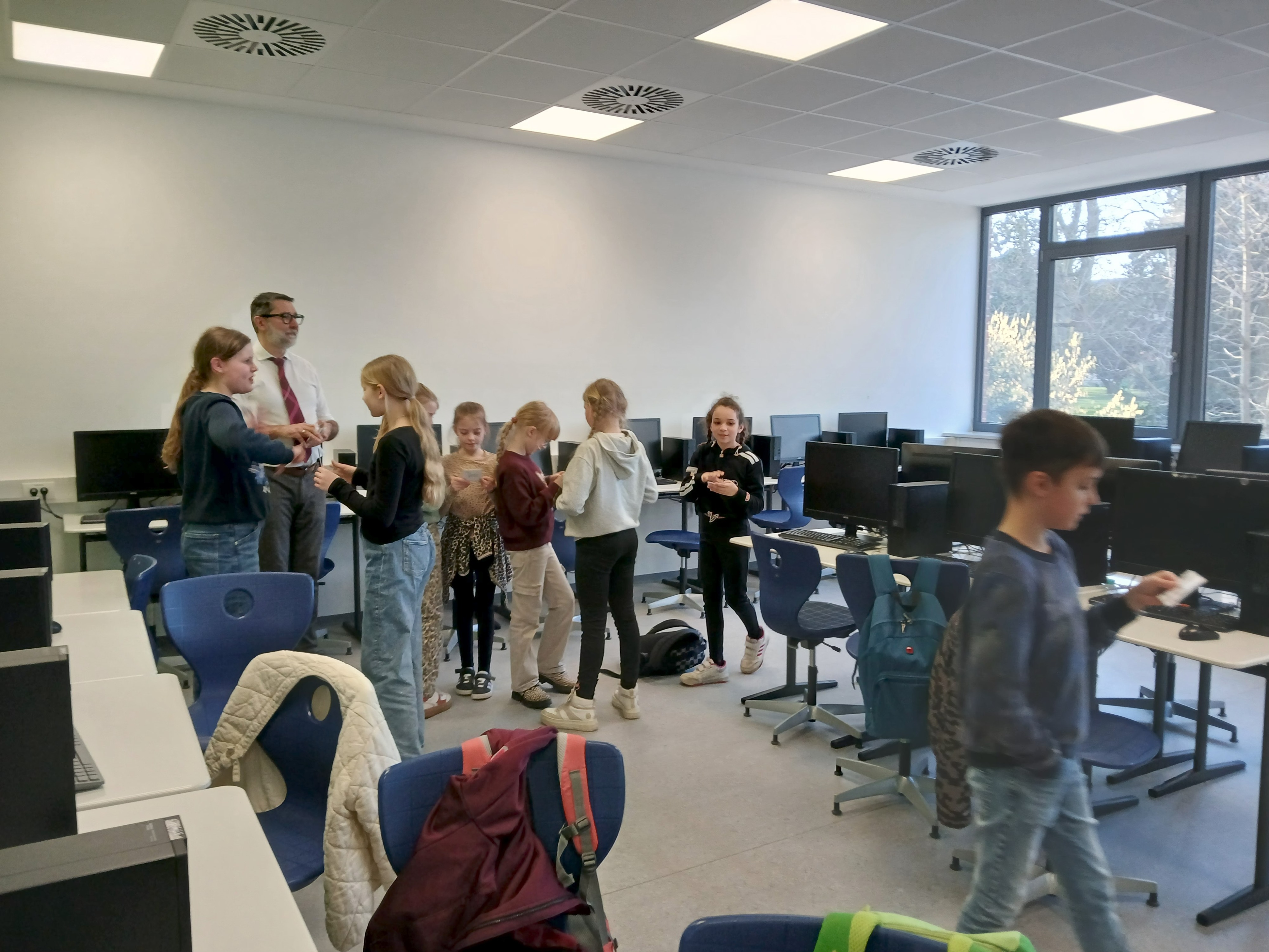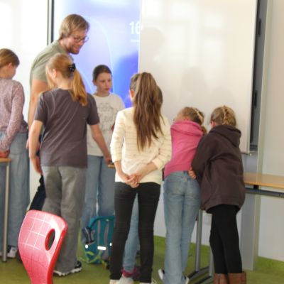 Herr Ploeger-Lobeck stellte zu Beginn die beteiligten Lehrkräfte vor. Im Anschluss wurde ein Gruppenfoto mit den Grundschülerinnen und Grundschülern aufgenommen. Danach fanden sich die Schülerinnen und Schüler in ihren jeweiligen Gruppen bei der ihnen zugewiesenen Lehrkraft ein, die sie an diesem Tag durch die verschiedenen Räumlichkeiten begleiten sollte. Gemeinsam führten die Lehrkräfte die insgesamt 18 Schülergruppen zu ihren Unterrichtsräumen, wo bereits die jeweiligen Fachlehrkräfte auf die schnuppernden Kinder warteten.
