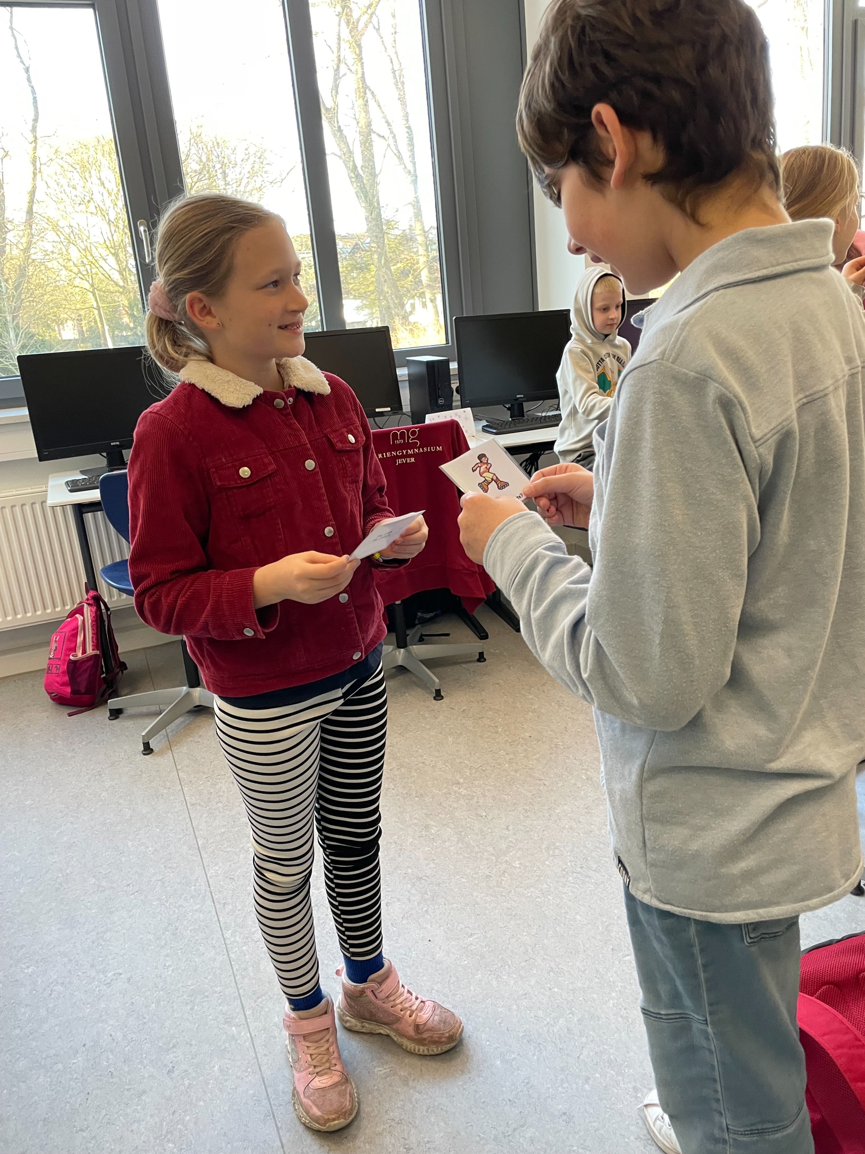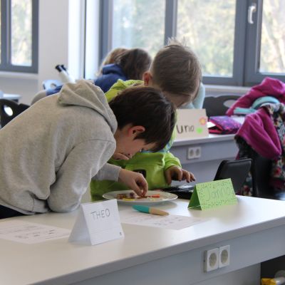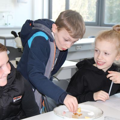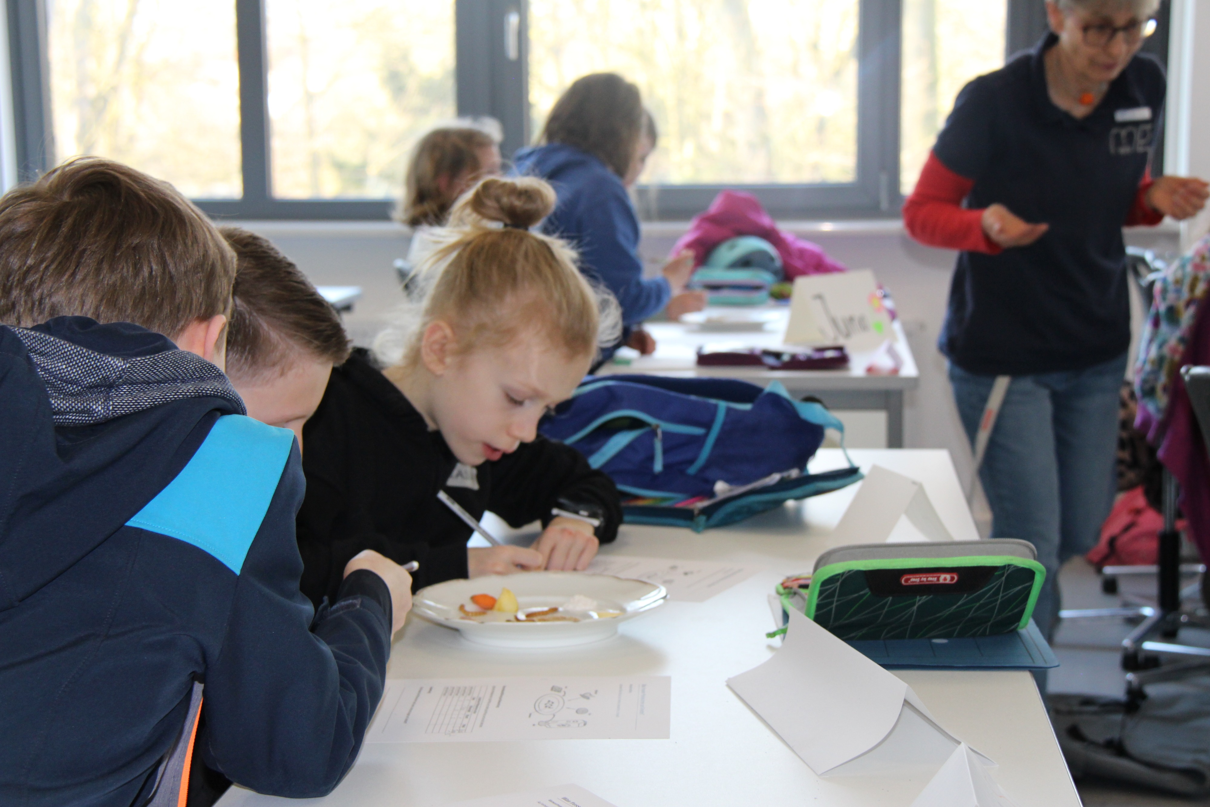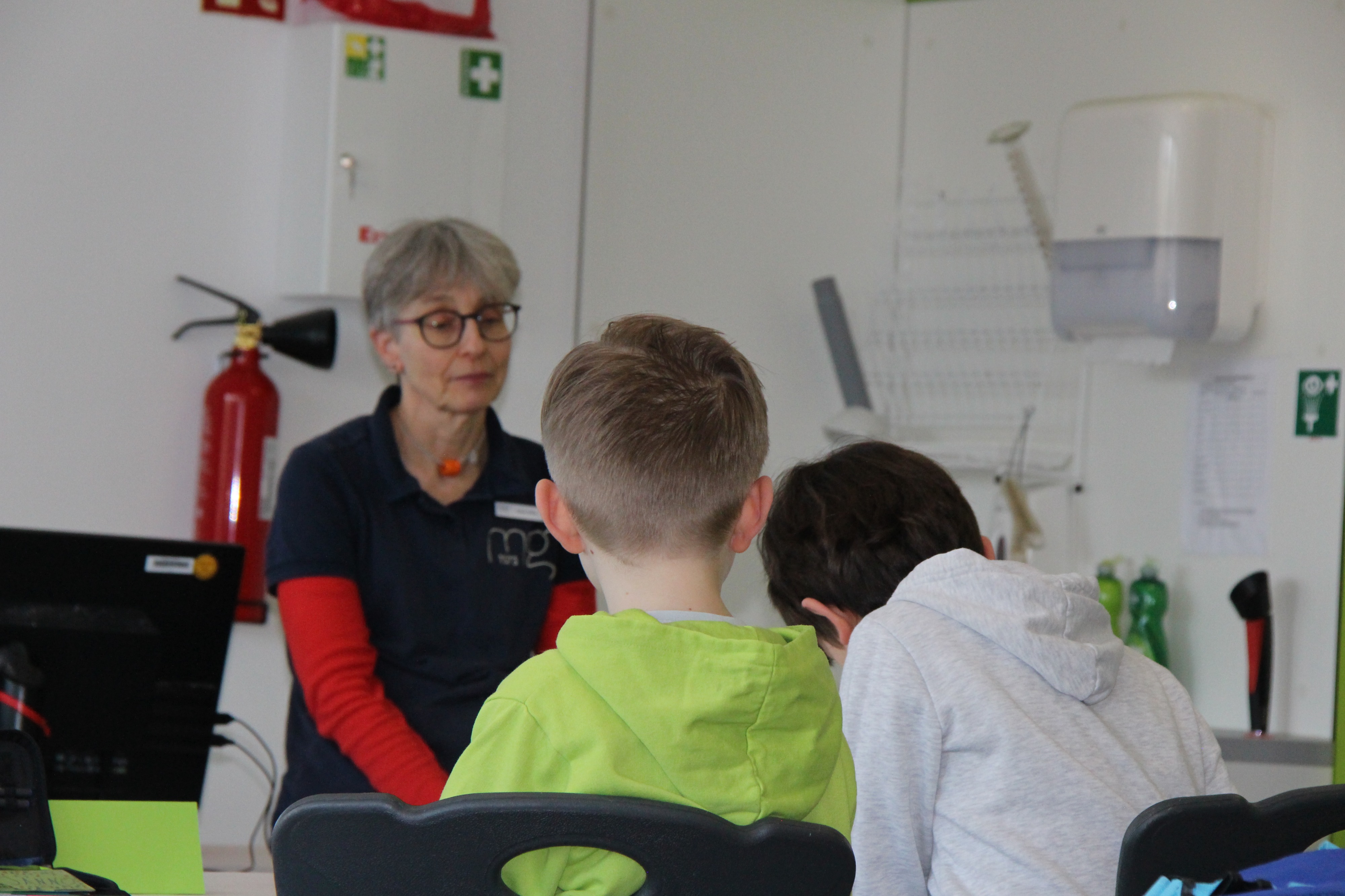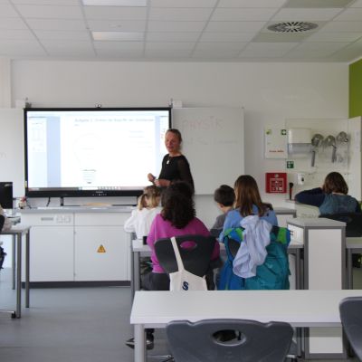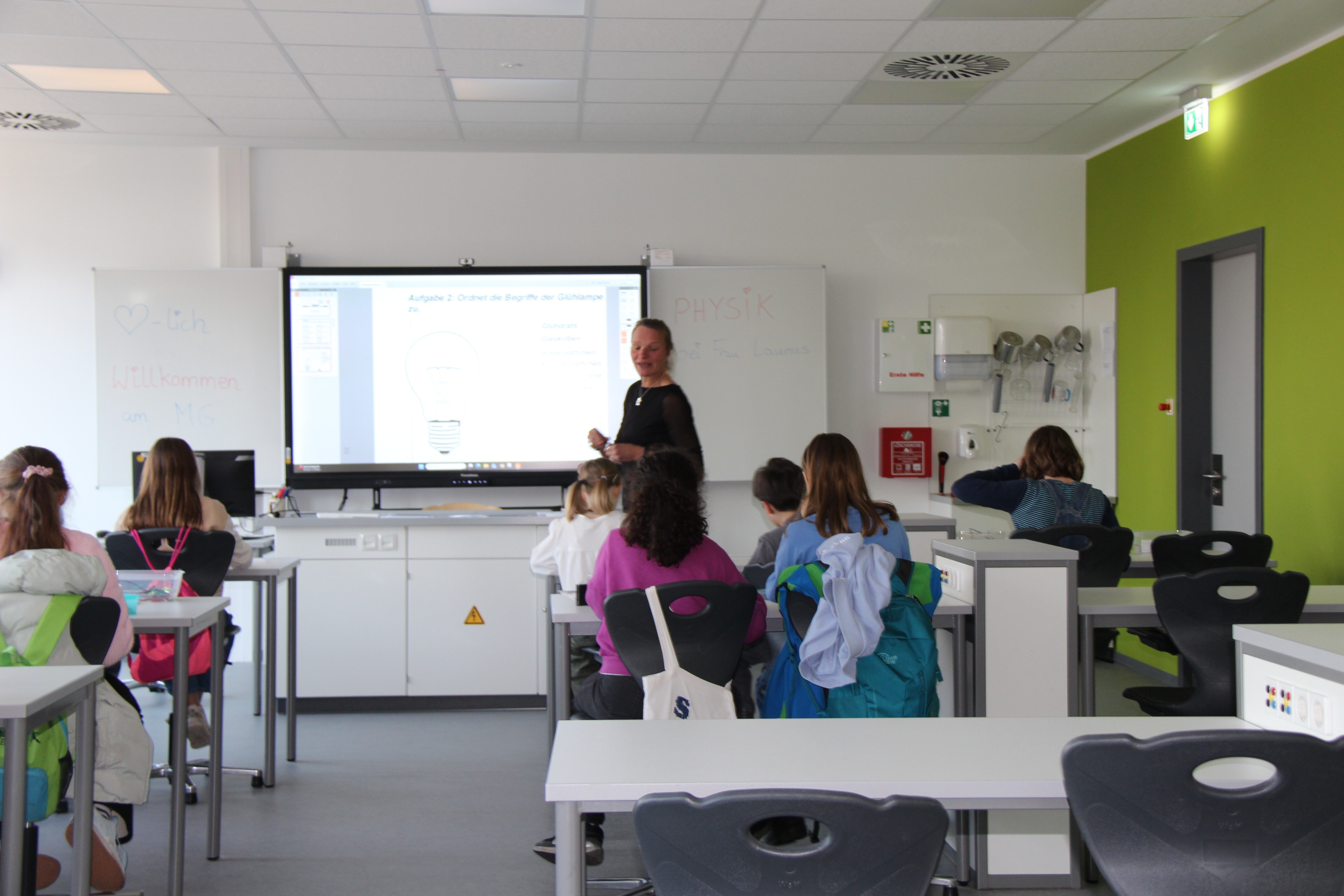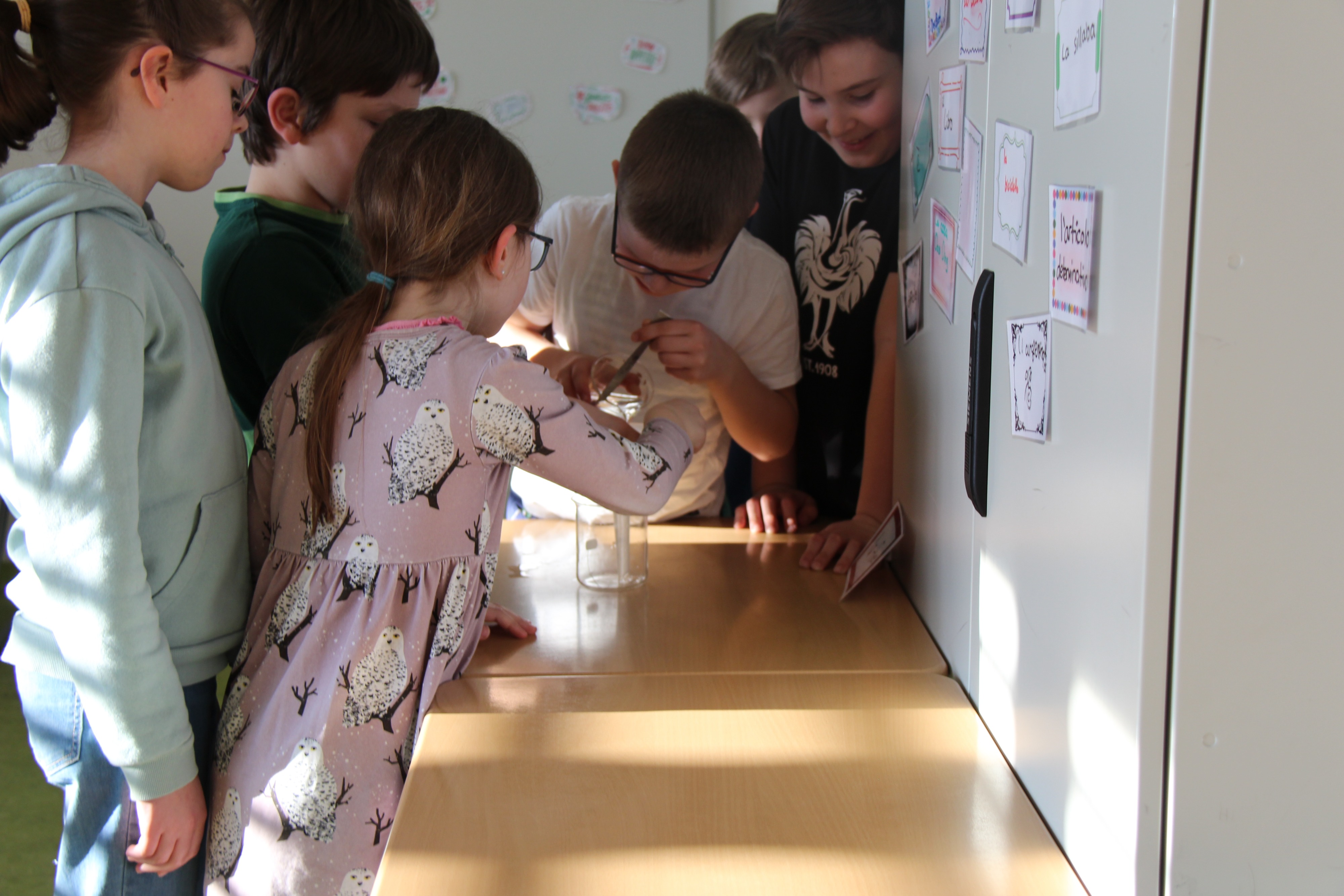 Herr Ploeger-Lobeck stellte zu Beginn die beteiligten Lehrkräfte vor. Im Anschluss wurde ein Gruppenfoto mit den Grundschülerinnen und Grundschülern aufgenommen. Danach fanden sich die Schülerinnen und Schüler in ihren jeweiligen Gruppen bei der ihnen zugewiesenen Lehrkraft ein, die sie an diesem Tag durch die verschiedenen Räumlichkeiten begleiten sollte. Gemeinsam führten die Lehrkräfte die insgesamt 18 Schülergruppen zu ihren Unterrichtsräumen, wo bereits die jeweiligen Fachlehrkräfte auf die schnuppernden Kinder warteten.