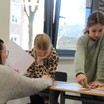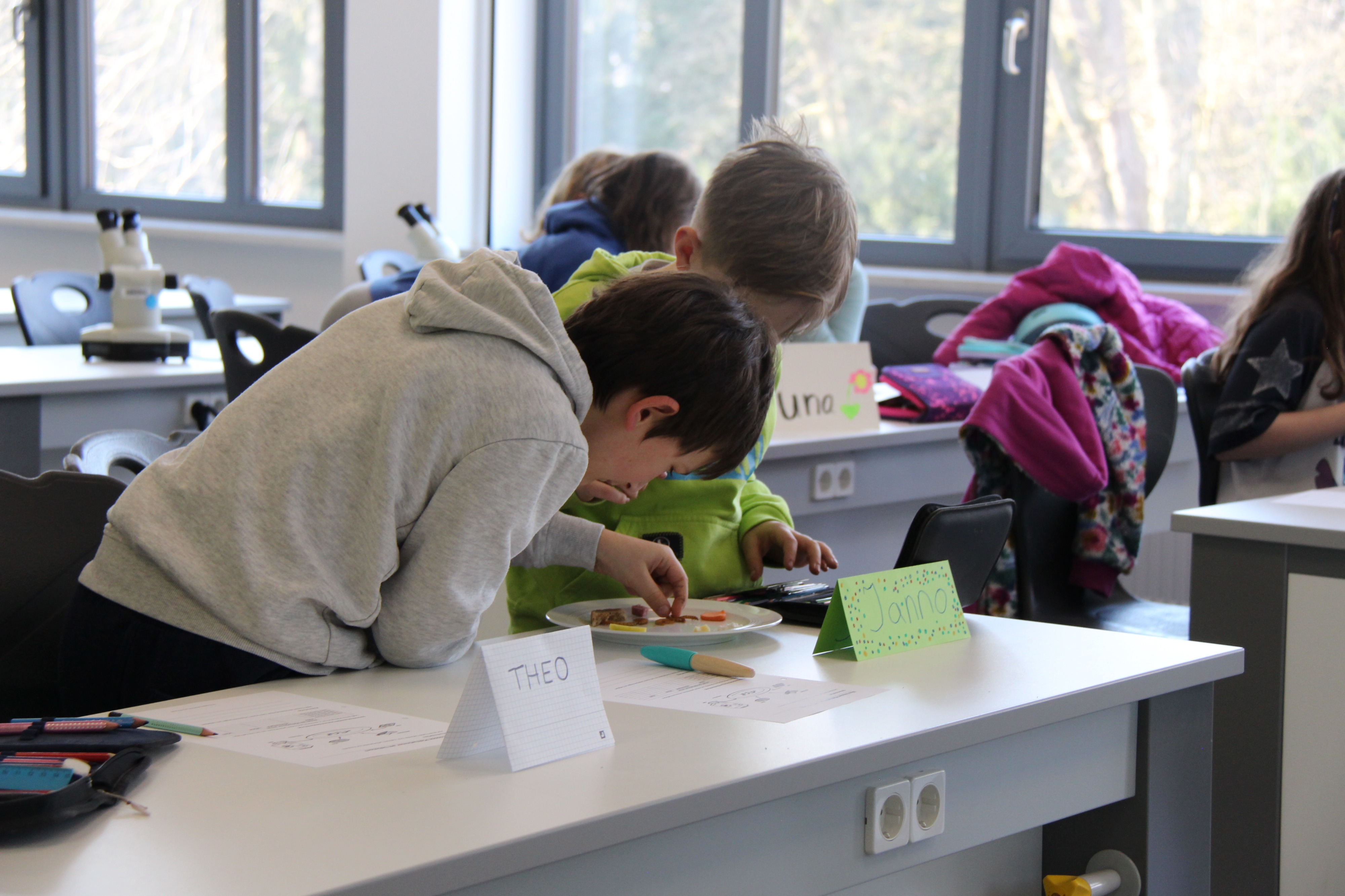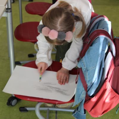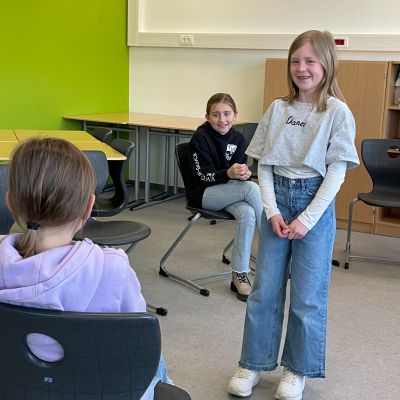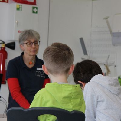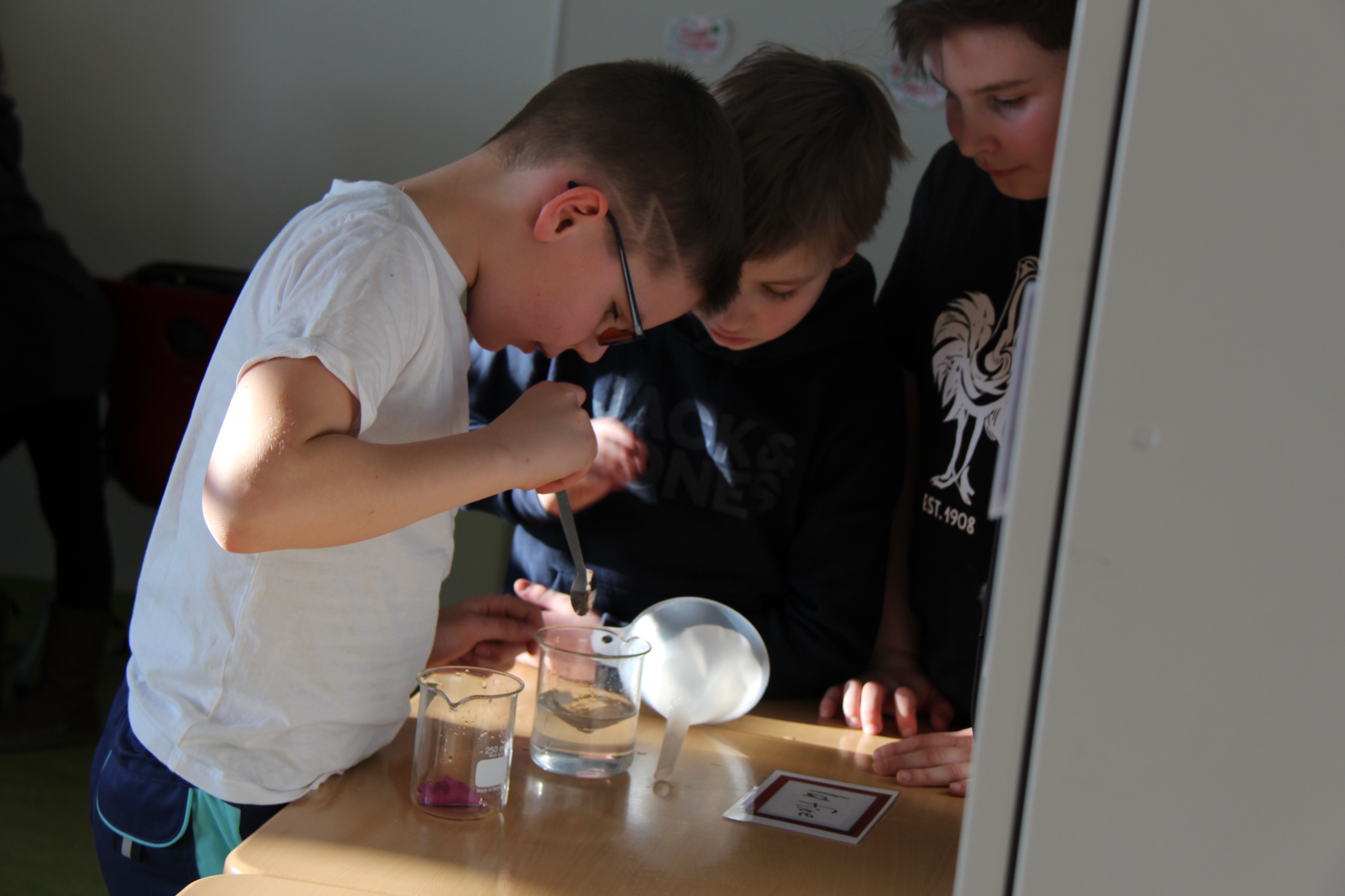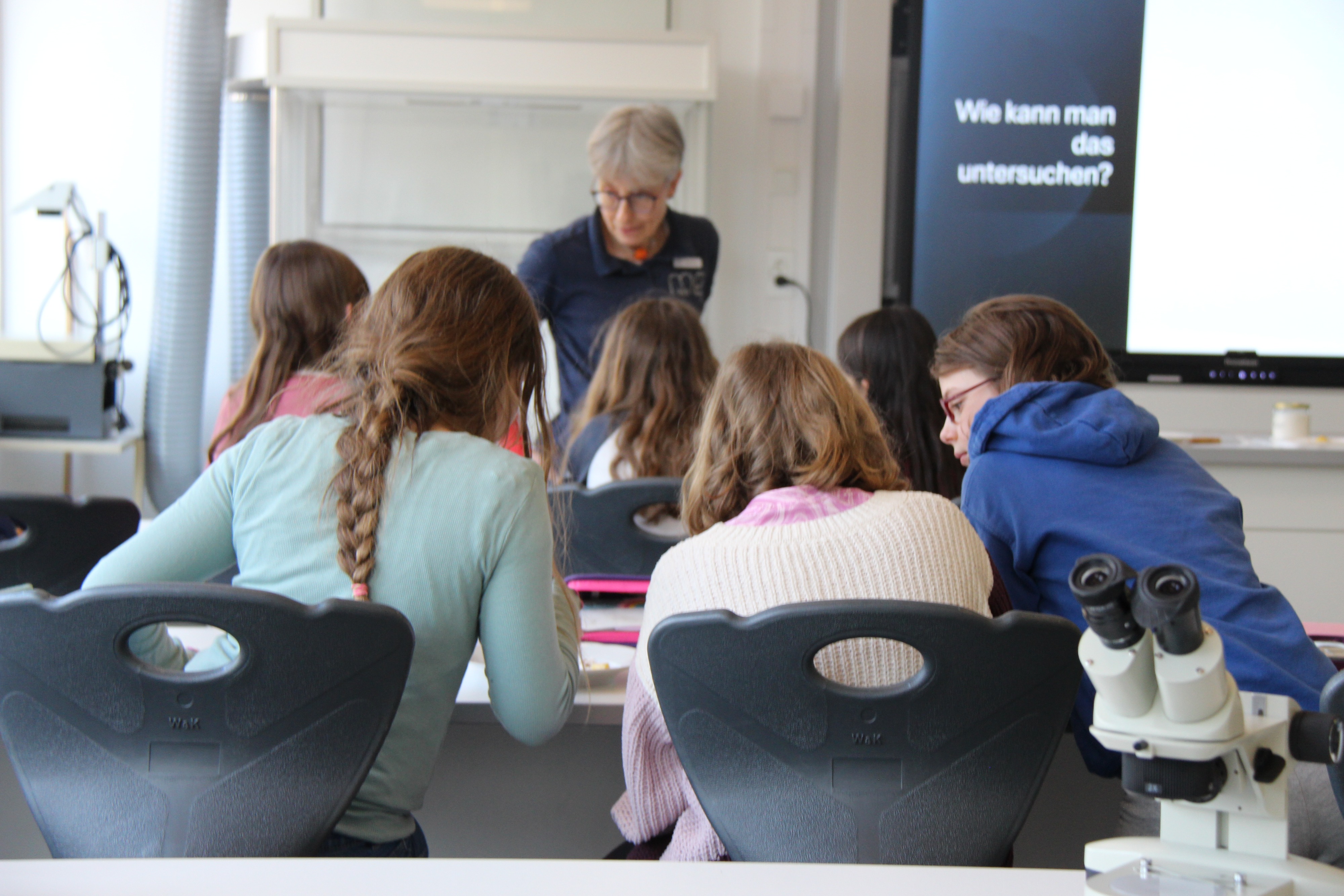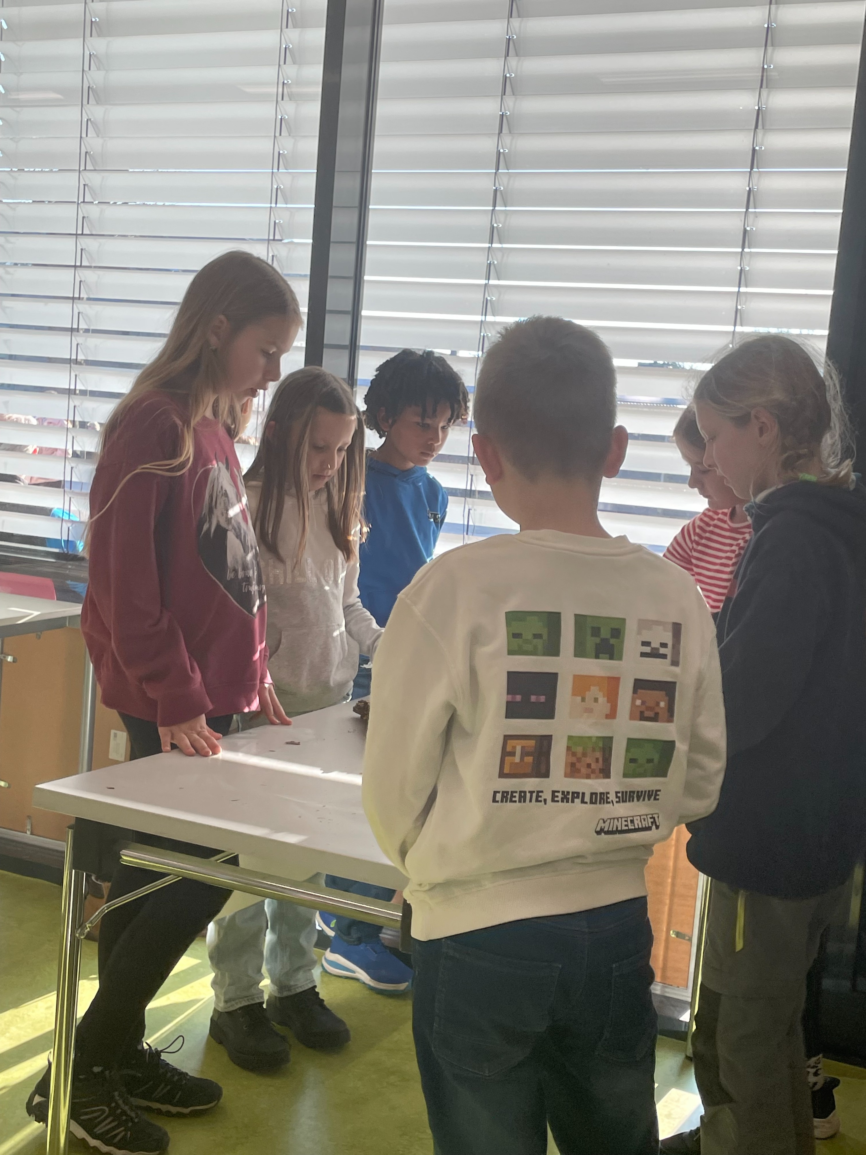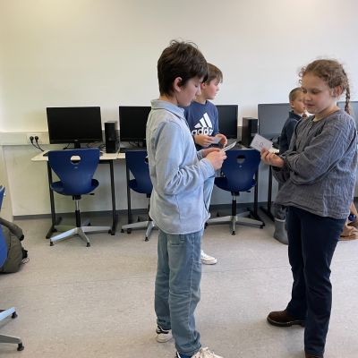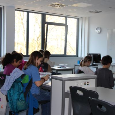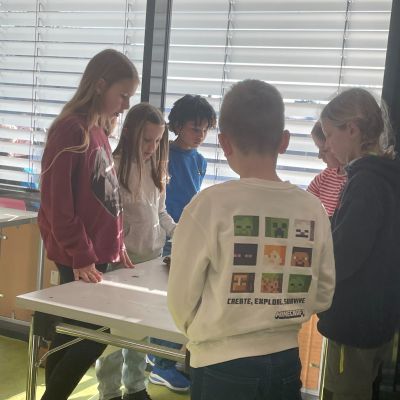 Herr Ploeger-Lobeck stellte zu Beginn die beteiligten Lehrkräfte vor. Im Anschluss wurde ein Gruppenfoto mit den Grundschülerinnen und Grundschülern aufgenommen. Danach fanden sich die Schülerinnen und Schüler in ihren jeweiligen Gruppen bei der ihnen zugewiesenen Lehrkraft ein, die sie an diesem Tag durch die verschiedenen Räumlichkeiten begleiten sollte. Gemeinsam führten die Lehrkräfte die insgesamt 18 Schülergruppen zu ihren Unterrichtsräumen, wo bereits die jeweiligen Fachlehrkräfte auf die schnuppernden Kinder warteten.