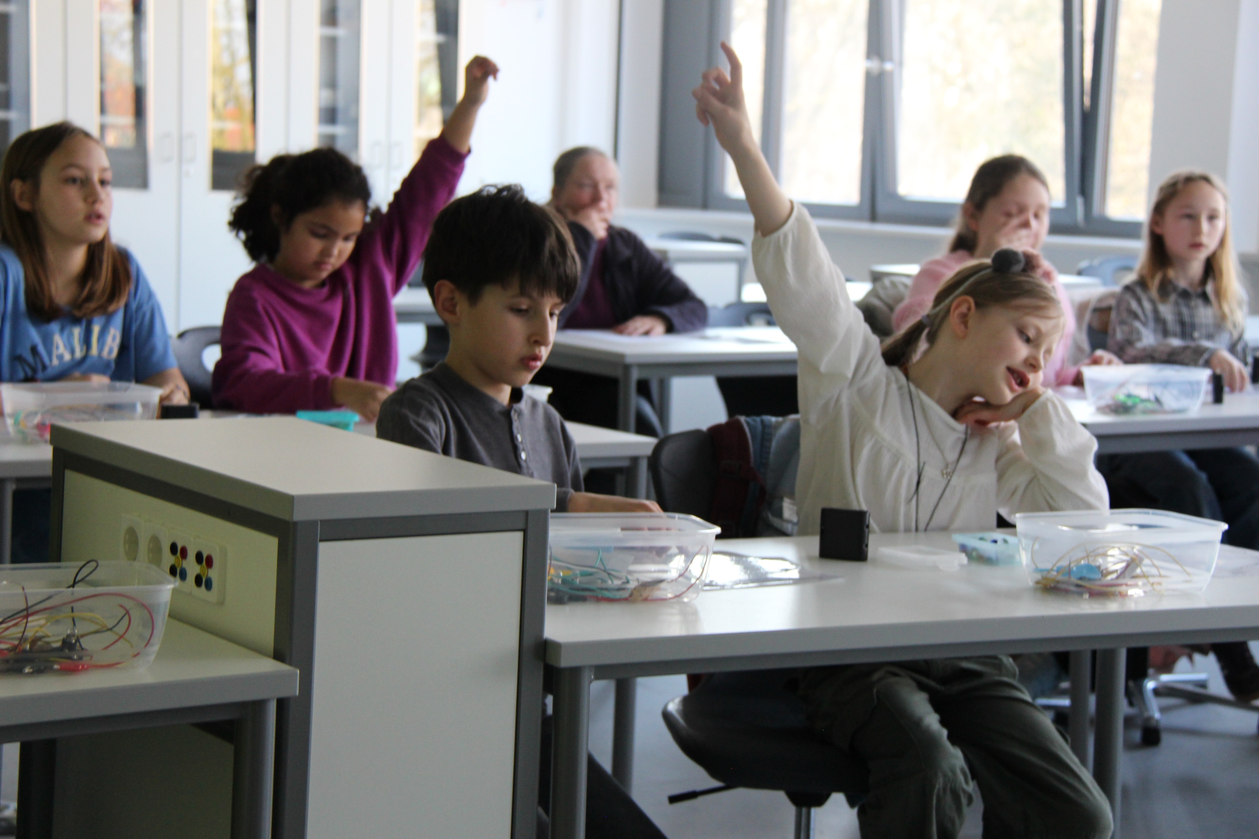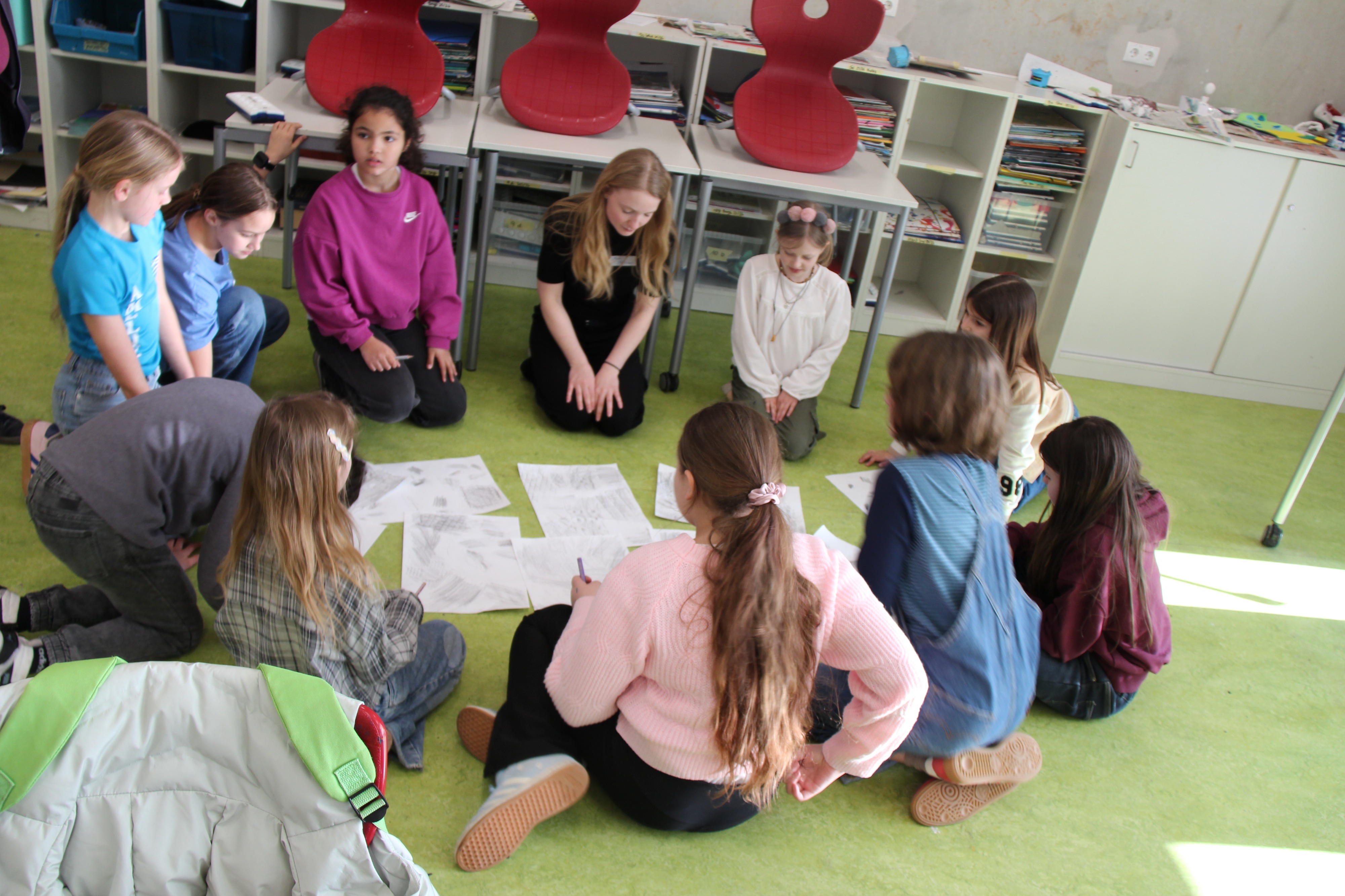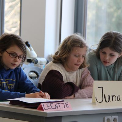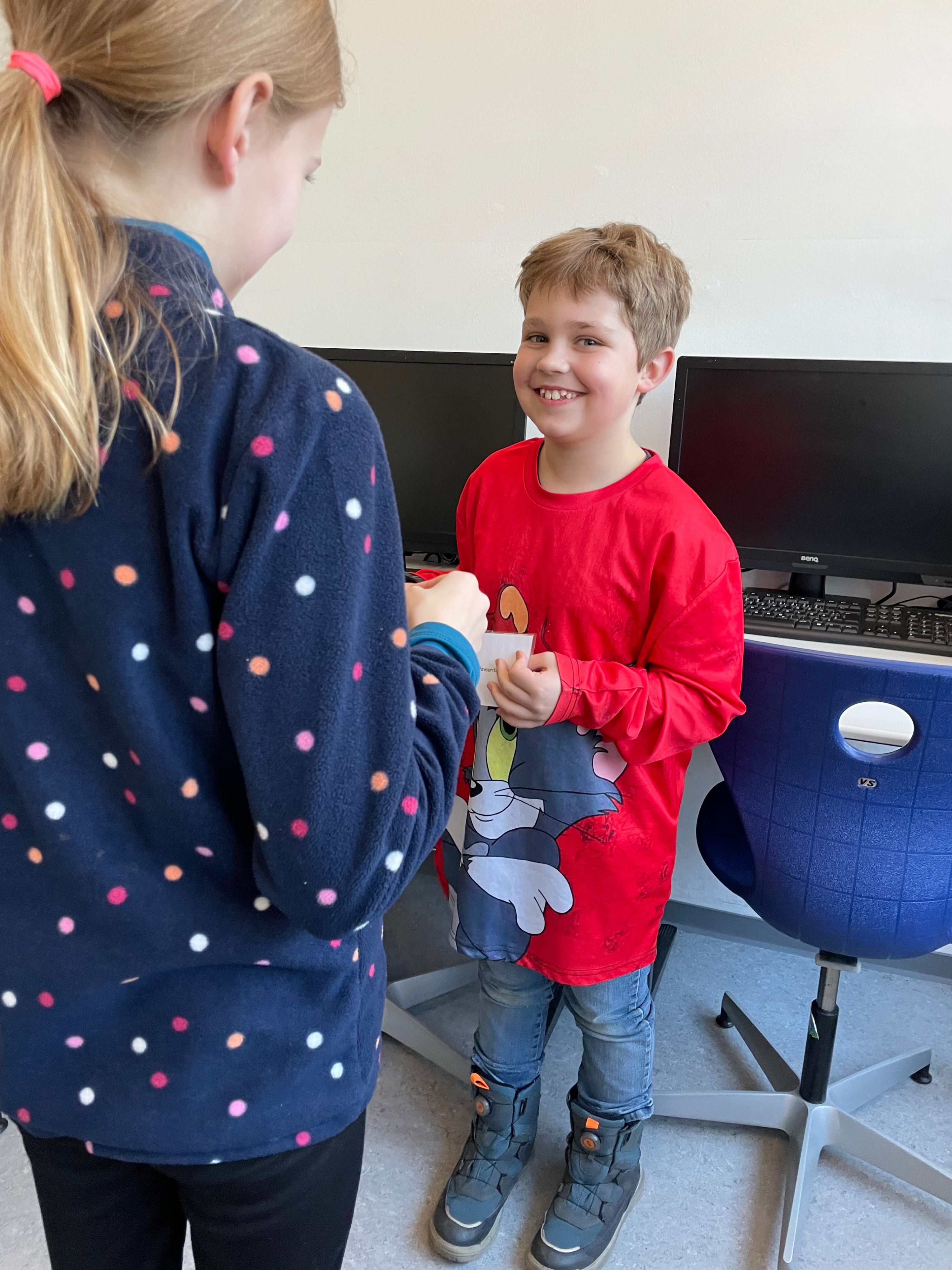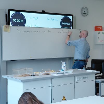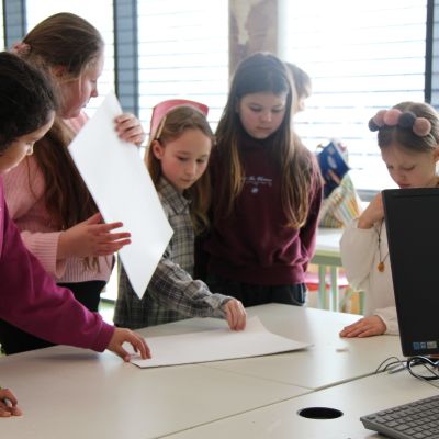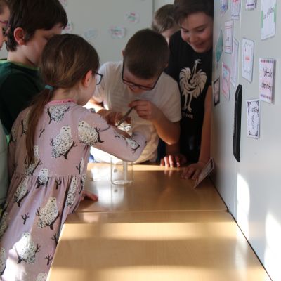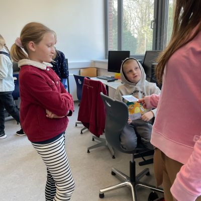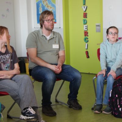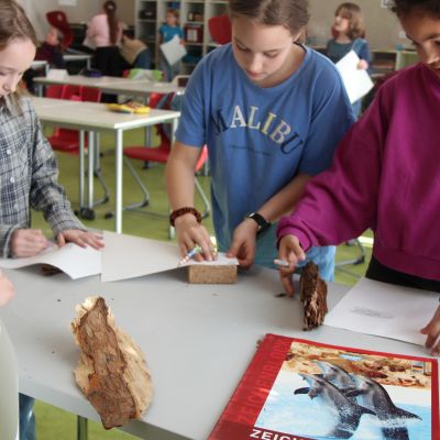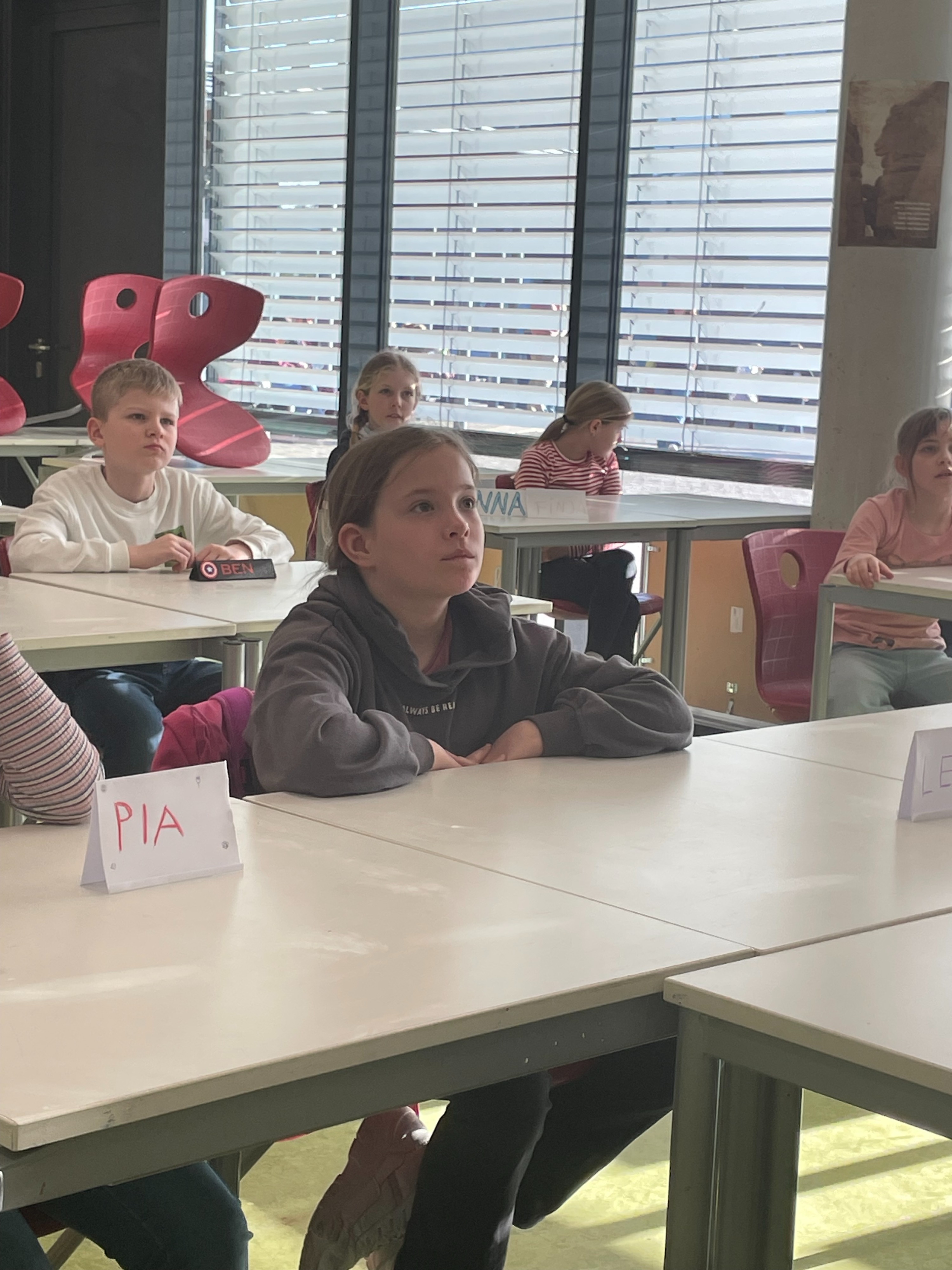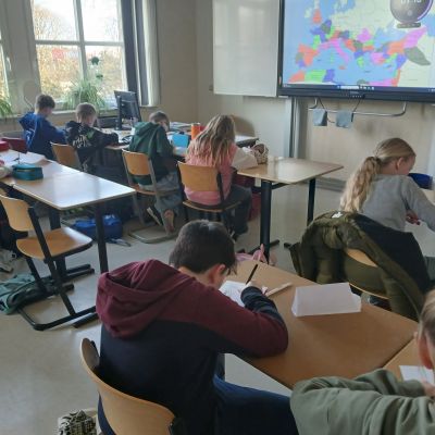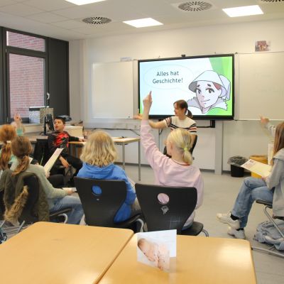 Herr Ploeger-Lobeck stellte zu Beginn die beteiligten Lehrkräfte vor. Im Anschluss wurde ein Gruppenfoto mit den Grundschülerinnen und Grundschülern aufgenommen. Danach fanden sich die Schülerinnen und Schüler in ihren jeweiligen Gruppen bei der ihnen zugewiesenen Lehrkraft ein, die sie an diesem Tag durch die verschiedenen Räumlichkeiten begleiten sollte. Gemeinsam führten die Lehrkräfte die insgesamt 18 Schülergruppen zu ihren Unterrichtsräumen, wo bereits die jeweiligen Fachlehrkräfte auf die schnuppernden Kinder warteten.