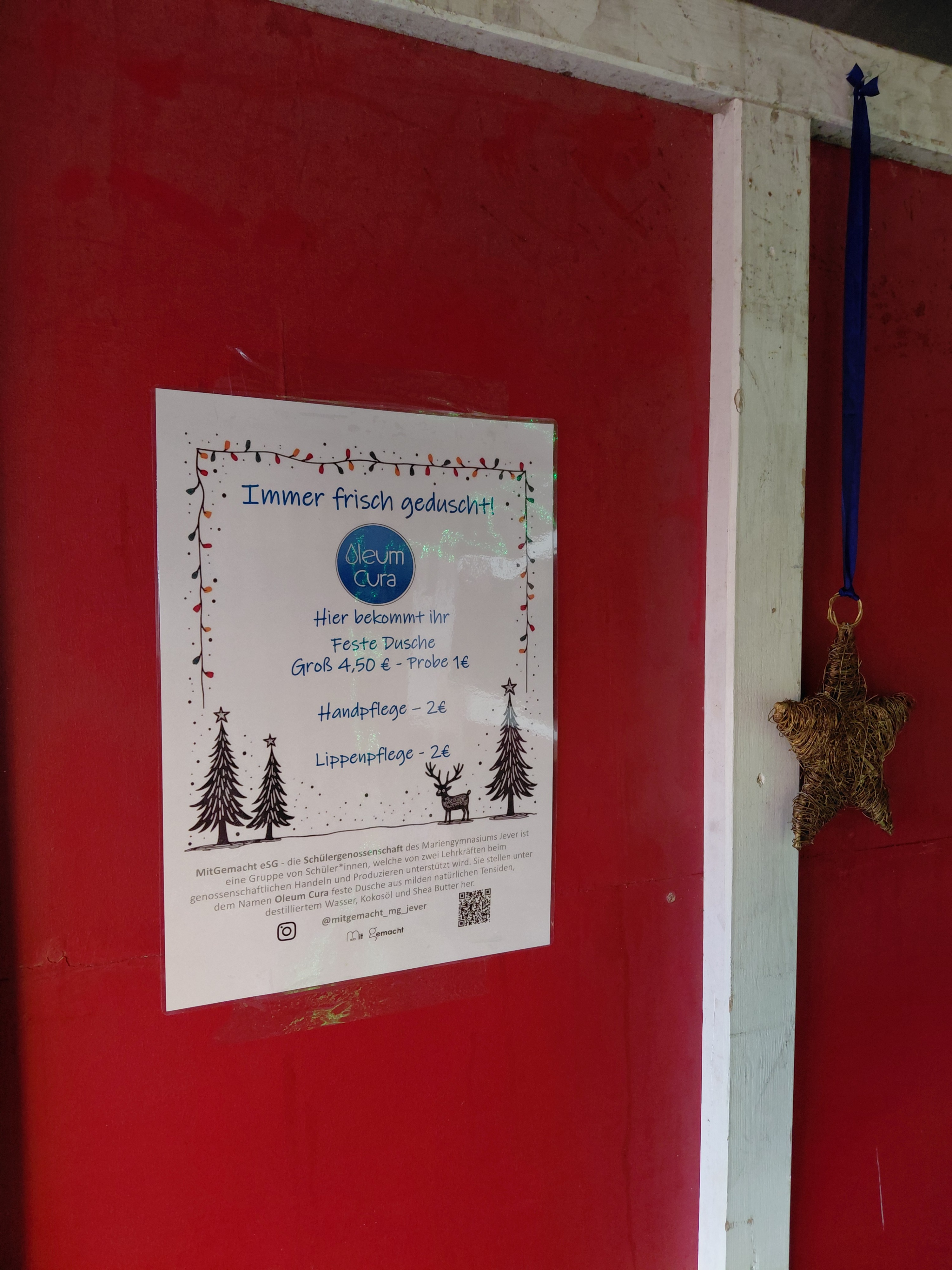 In der Wechselhütte der Stadt Jever bot die Schülergenossenschaft von Montag bis Donnerstag jeweils von 13:30 bis 18:00 Uhr ihre diesjährige Weihnachtsedition an. Dabei handelte es sich um eine echte Surprise-Dusche: Die Käuferinnen und Käufer mussten selbst erschnüffeln, welche Duftvariante sie erwischt hatten. Zur Auswahl standen zwei weihnachtliche Düfte – Vanille oder Lebkuchen.