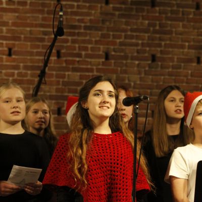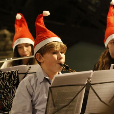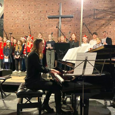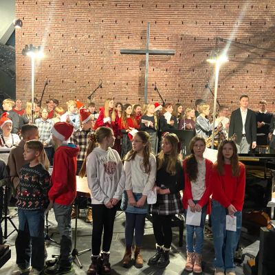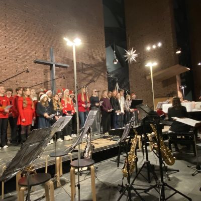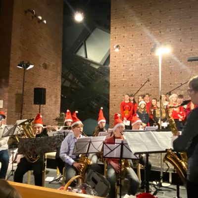 Zum Abschluss vereinten sich MG-Voices, die Bläserklasse 6b und die MG-JazzTones im stimmungsvollen „Have Yourself A Merry Little Christmas“. Dieser gemeinsame Klangkörper füllte die Kirche noch einmal mit einer Herzlichkeit, die perfekt zur Weihnachtszeit passte.