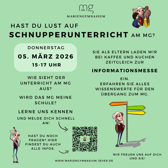 Für alle Schüler*innen im Jahrgang 4, die einen Einblick in den Schulalltag am Mariengymnasium gewinnen möchten, führen wir einen Schnupperunterricht am Donnerstag, 05. März 2026 in unserem Hause durch. Interessierte Schüler*innen erhalten die Möglichkeit, in drei Schulstunden einzutauchen und diese mitzuerleben. Und so läuft der Nachmittag für euch, liebe Schülerinnen und Schüler ab: