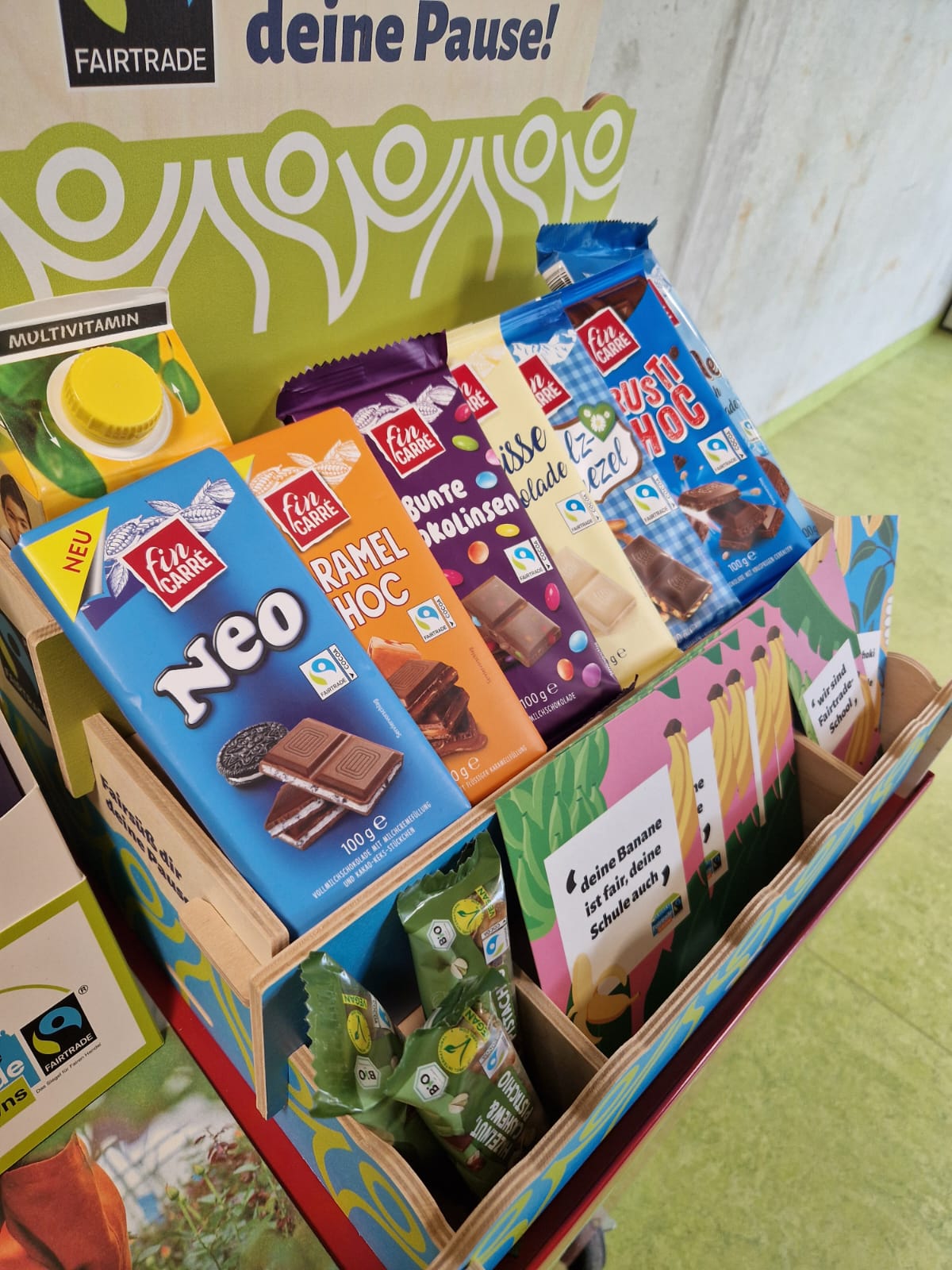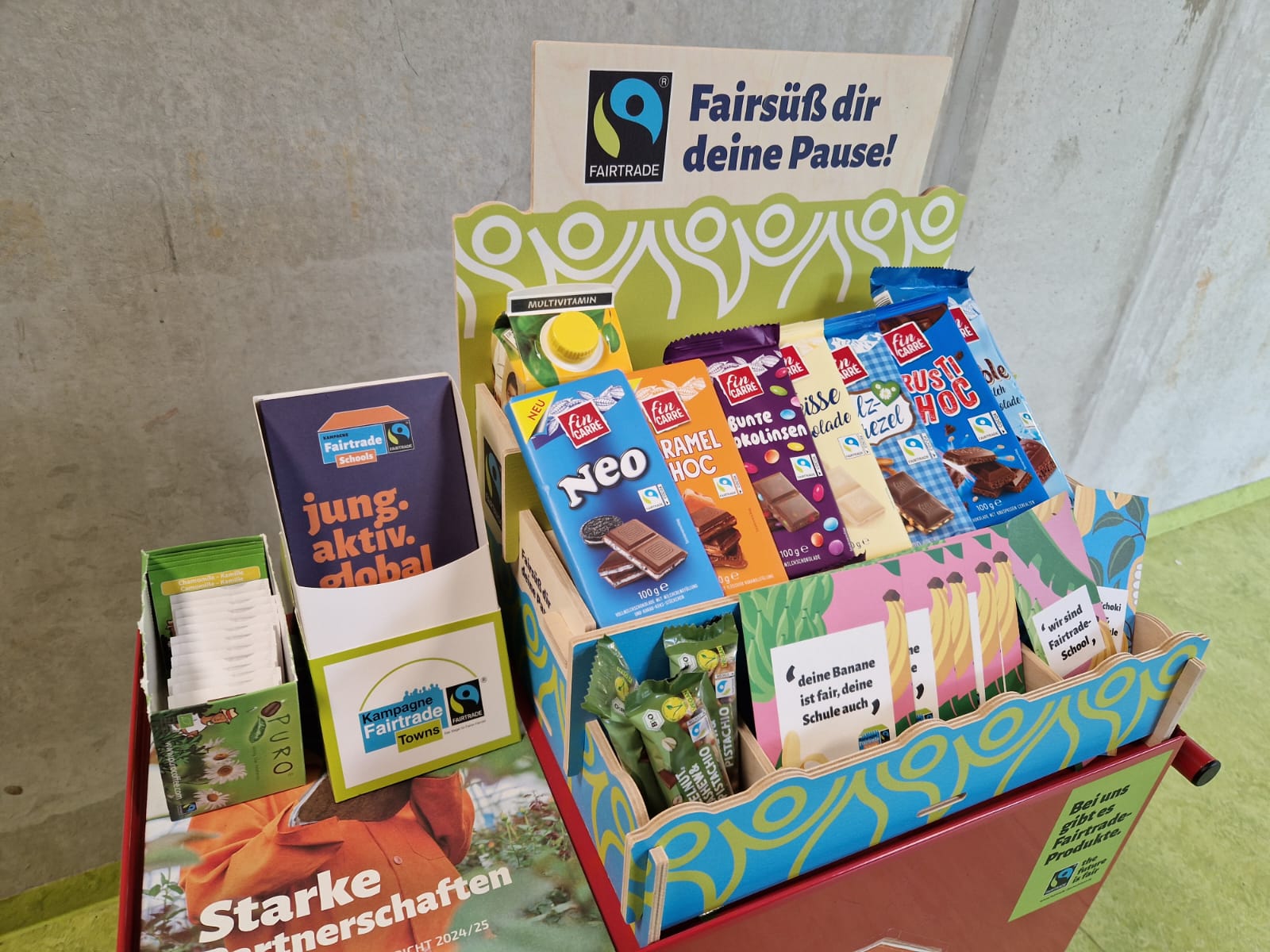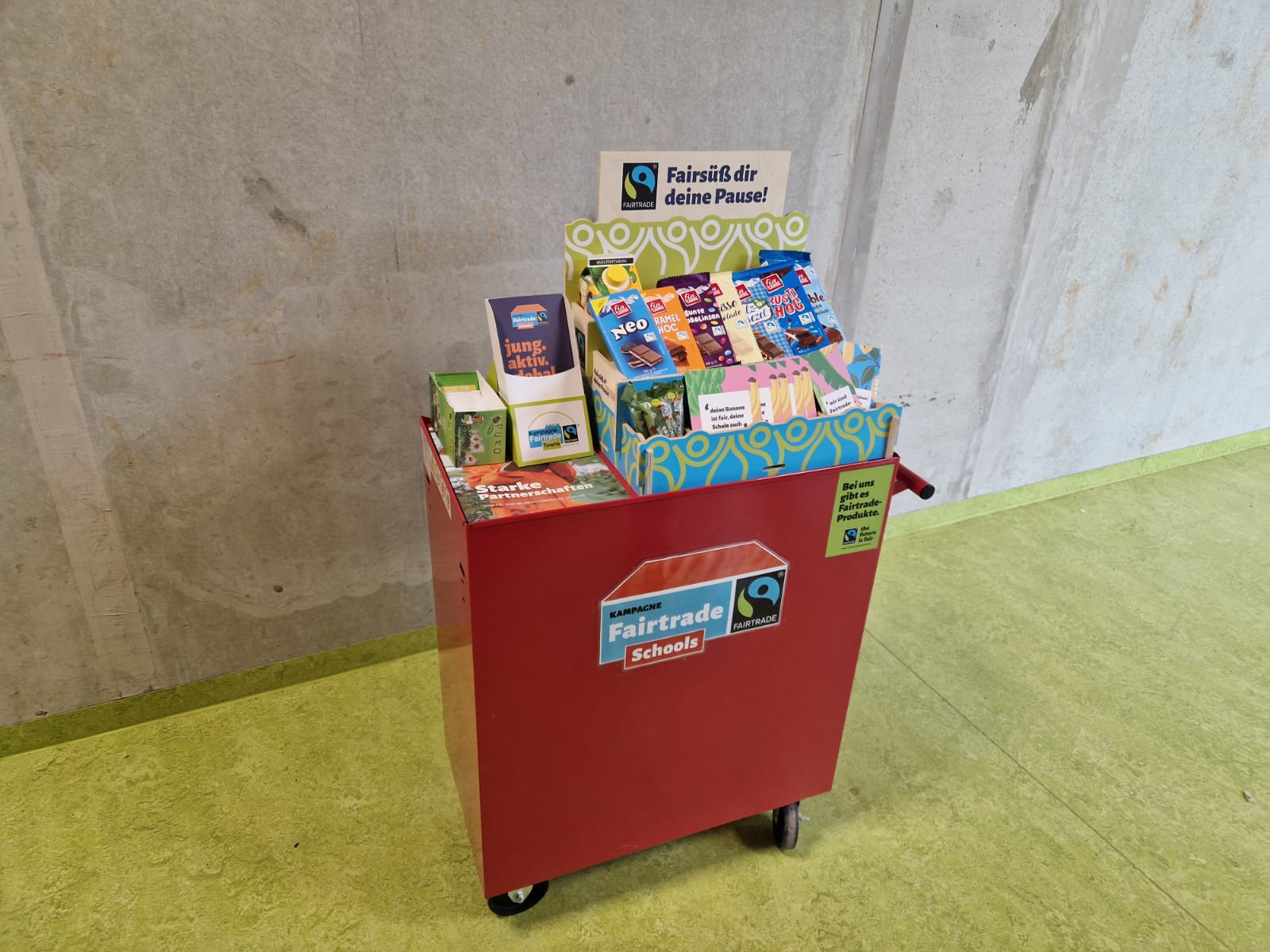 - Verkauf von fair gehandelten Produkten in den Pausen mit unserem roten “Rolli” in der Pausenhalle im A-Gebäude