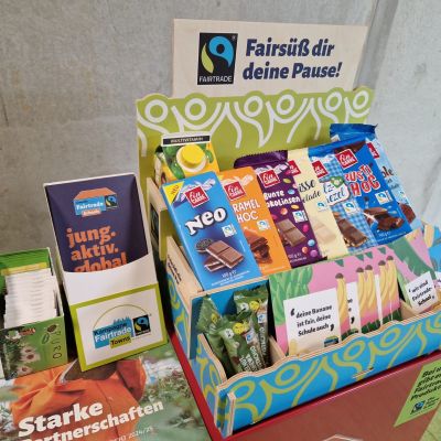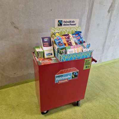 - Verkauf von fair gehandelten Produkten in den Pausen mit unserem roten “Rolli” in der Pausenhalle im A-Gebäude