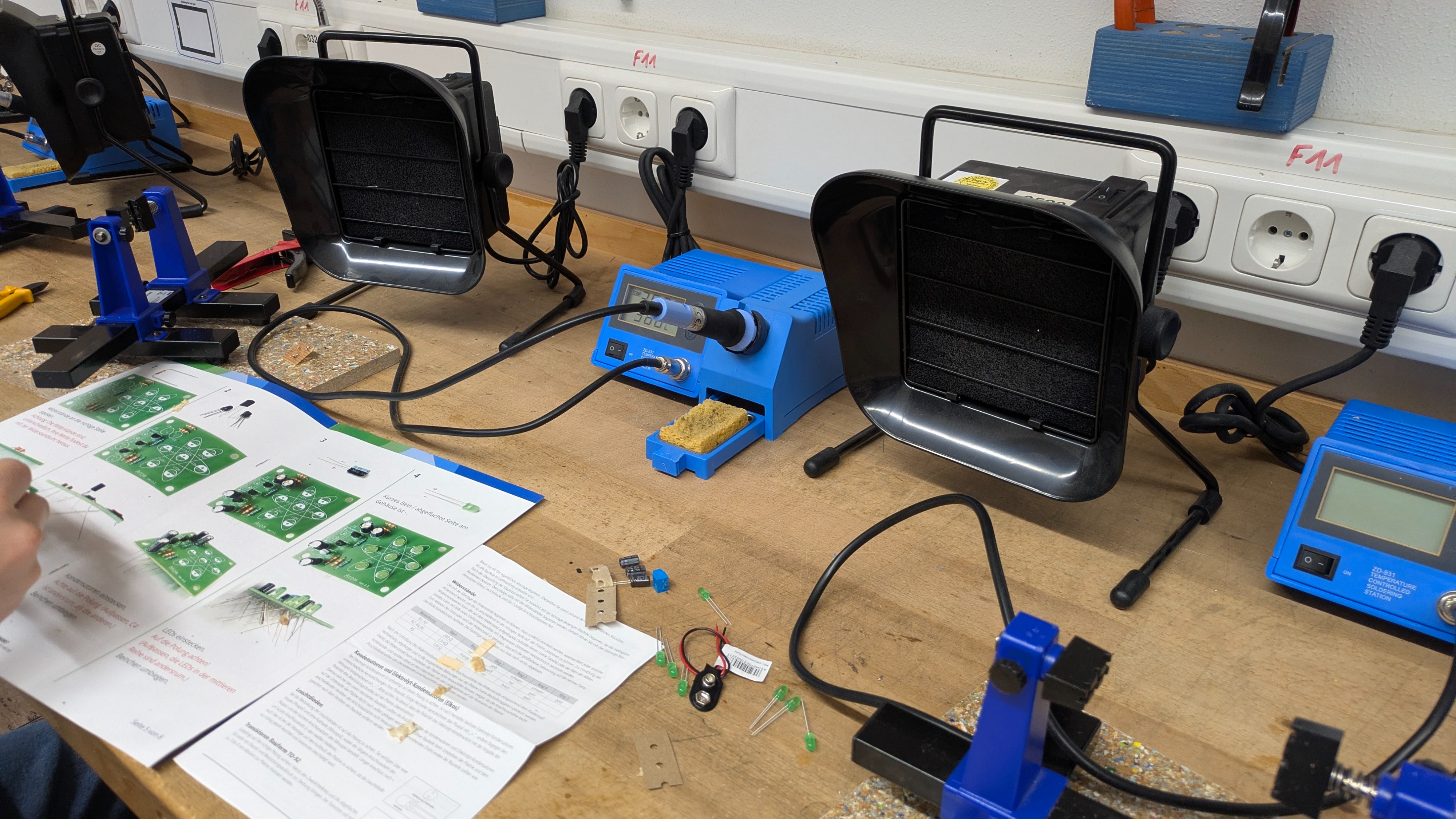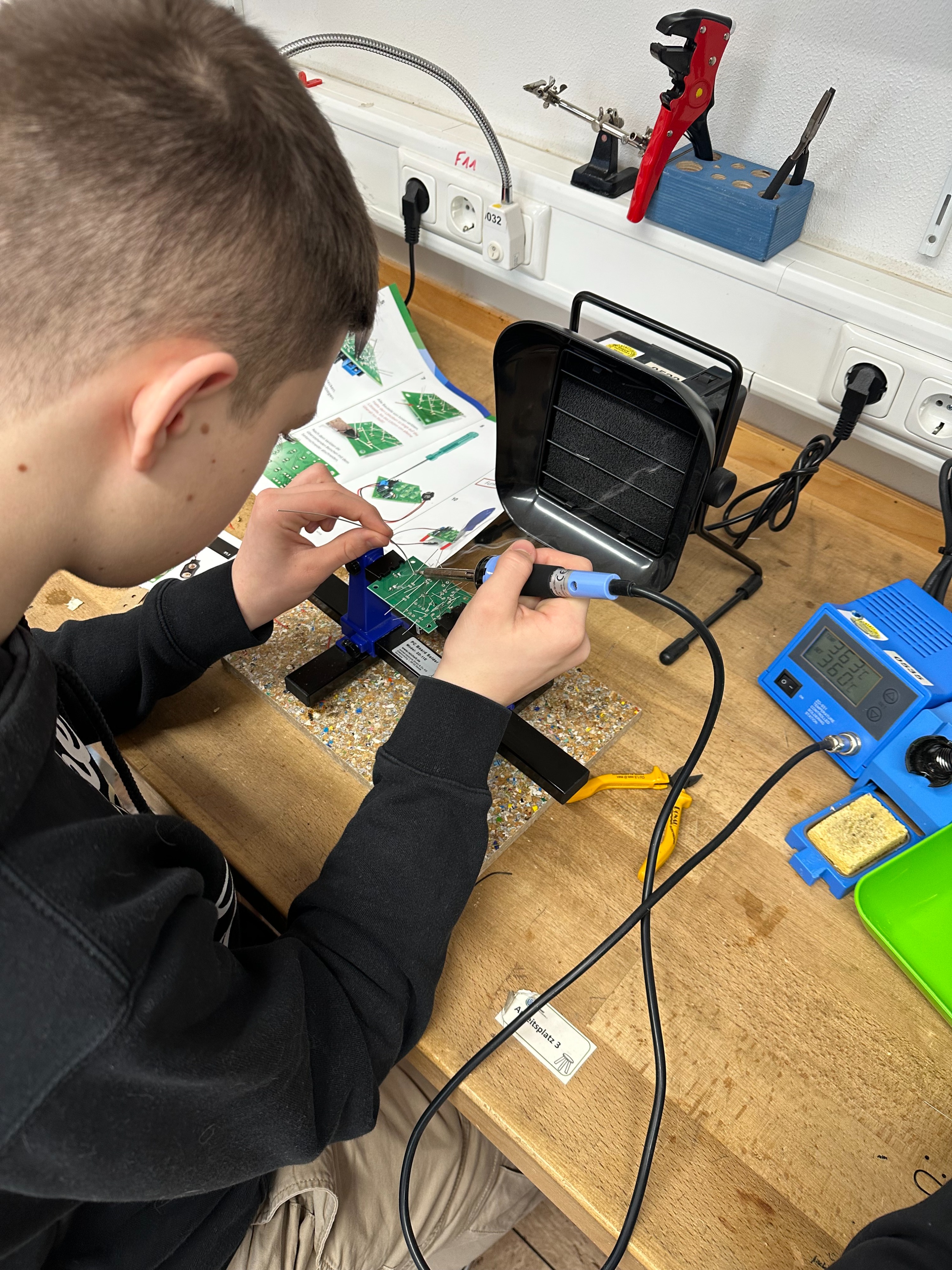 Anschließend bestückten die Schülerinnen und Schüler selbstständig eine Platine und löteten ihre eigene funktionierende Blinkschaltung. Dabei standen der sachgerechte Umgang mit Werkzeugen und Materialien sowie sicheres Arbeiten mit elektrischen Bauteilen im Vordergrund.