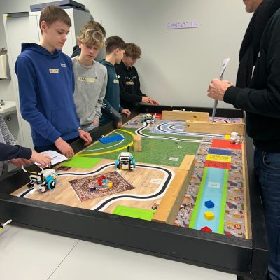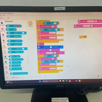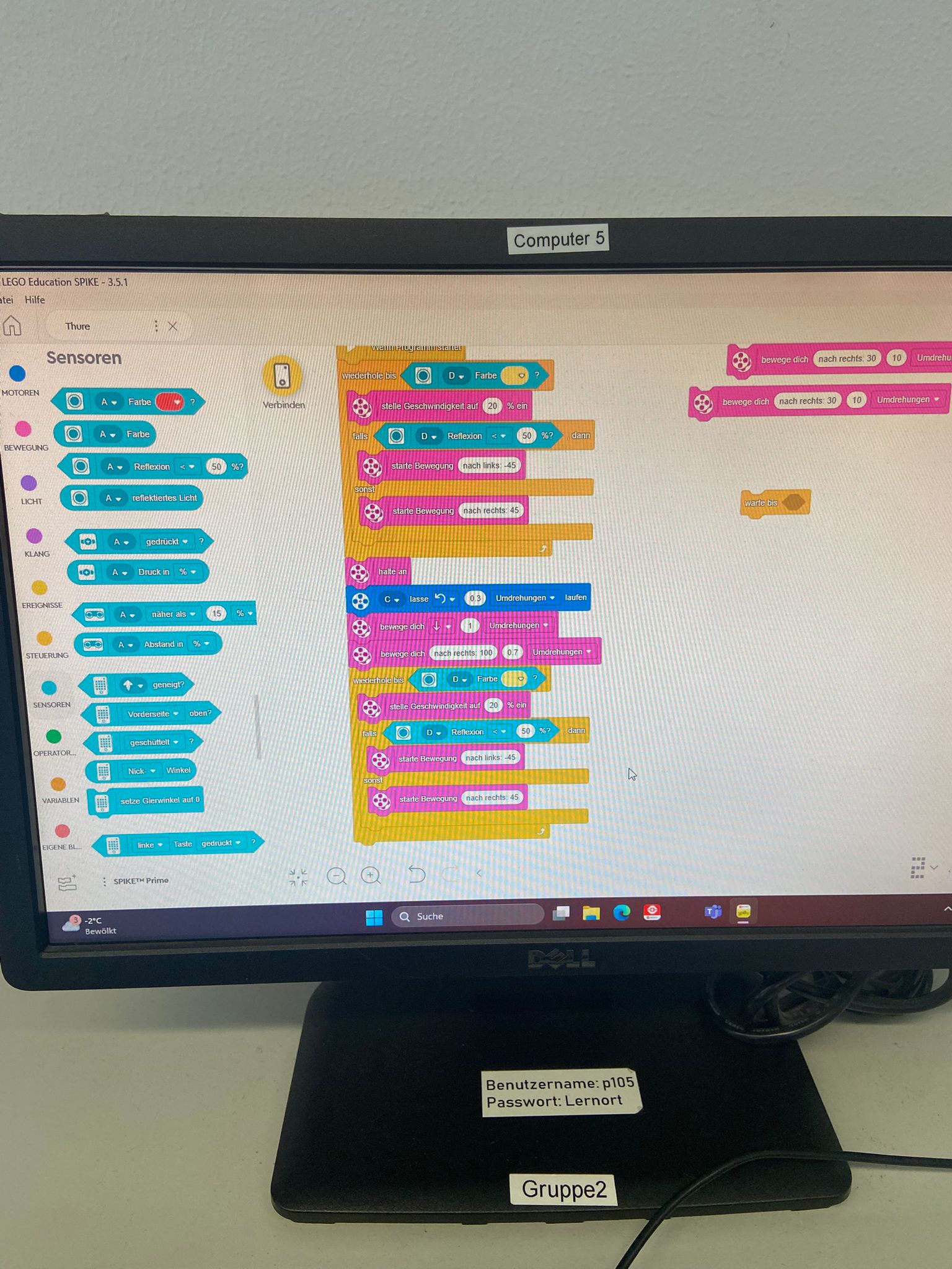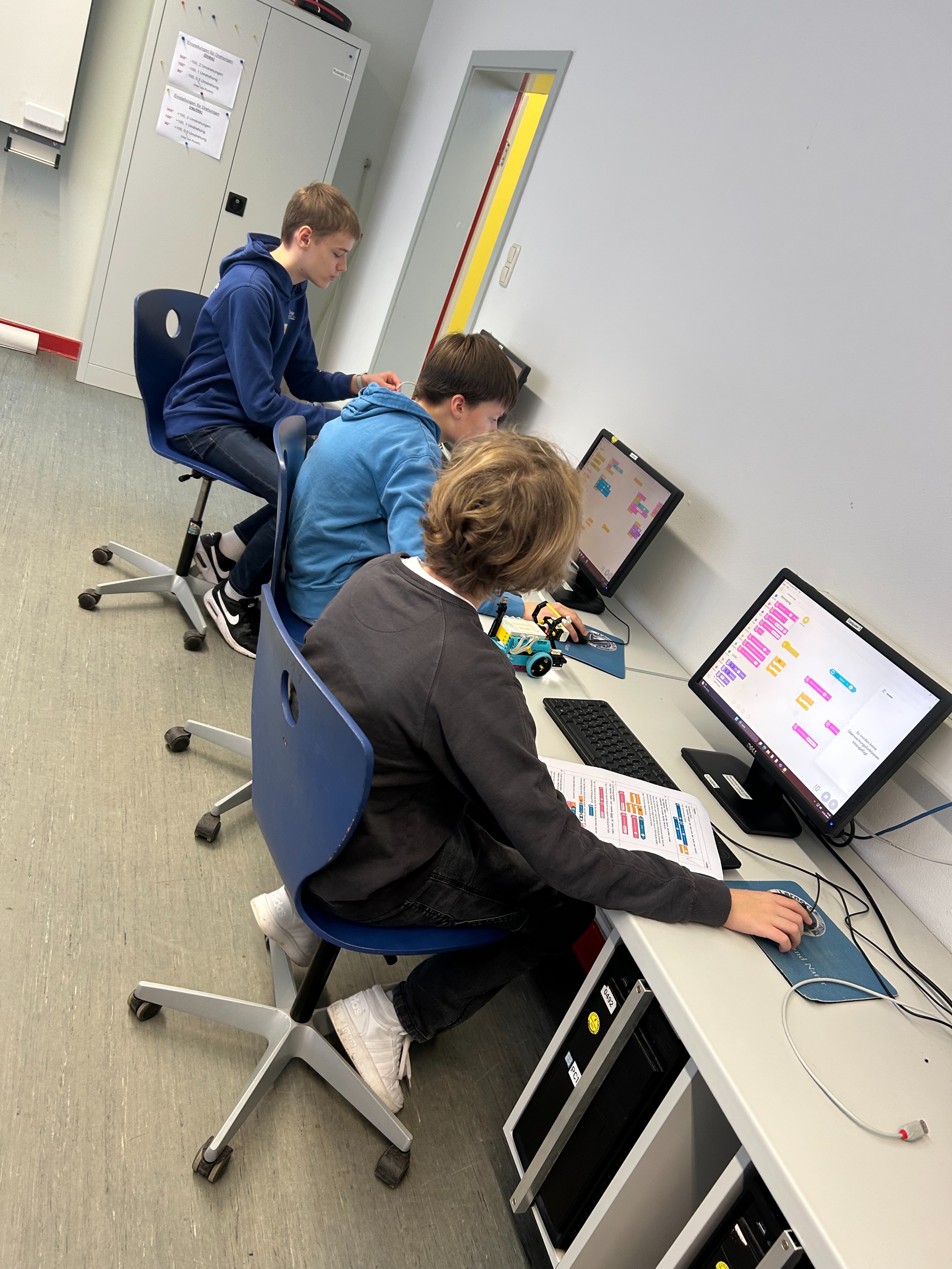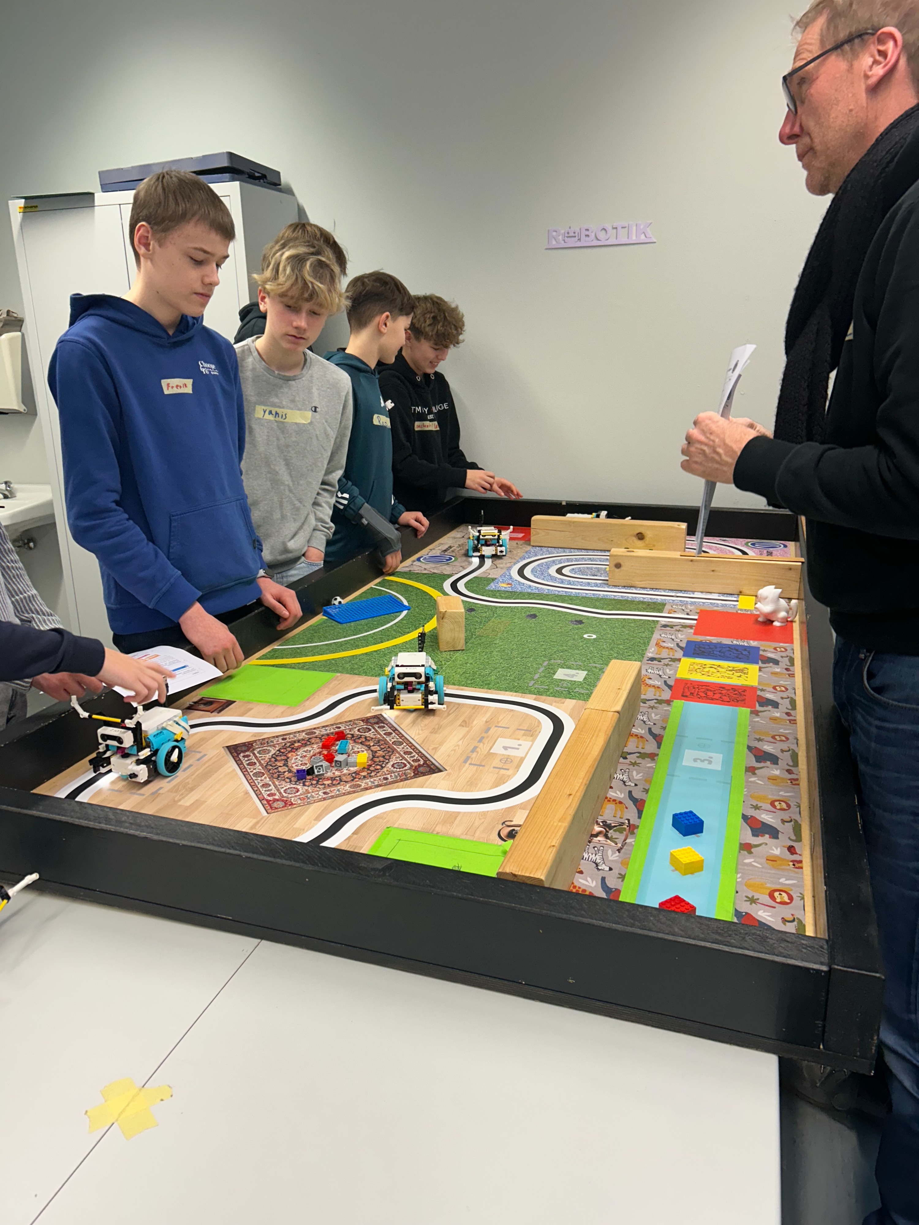 Der zweite Projekttag stand ganz im Zeichen der Robotik im Rahmen des Moduls „Smarthome (be)greifen“. Nach einer Einführung in das Eingabe–Verarbeitungs–Ausgabe-Prinzip programmierten die Schülerinnen und Schüler Lego-Spike-Roboter und legten dabei ihren „Roboter-Führerschein“ ab. Auf einem speziell entwickelten Spielfeld, das an die Arbeit eines Staubsaugerroboters erinnerte, bearbeiteten sie Aufgaben unterschiedlicher Schwierigkeitsstufen. So konnten sie eigene Lösungsstrategien entwickeln, ihre Programmierkenntnisse schrittweise erweitern und automatisierte Abläufe praktisch erproben.
