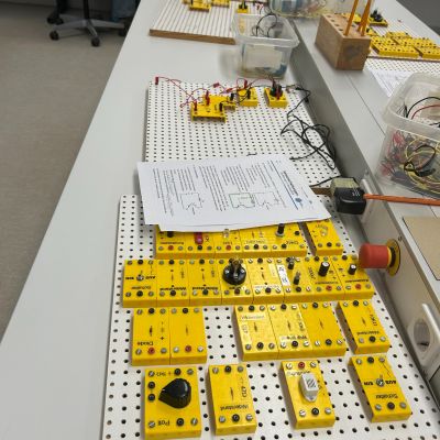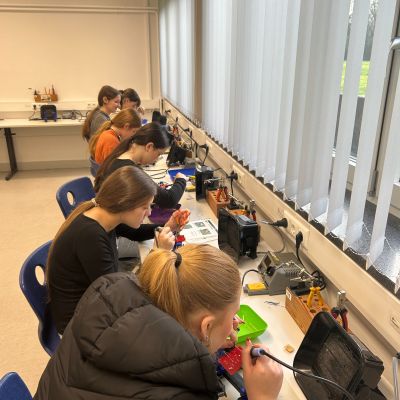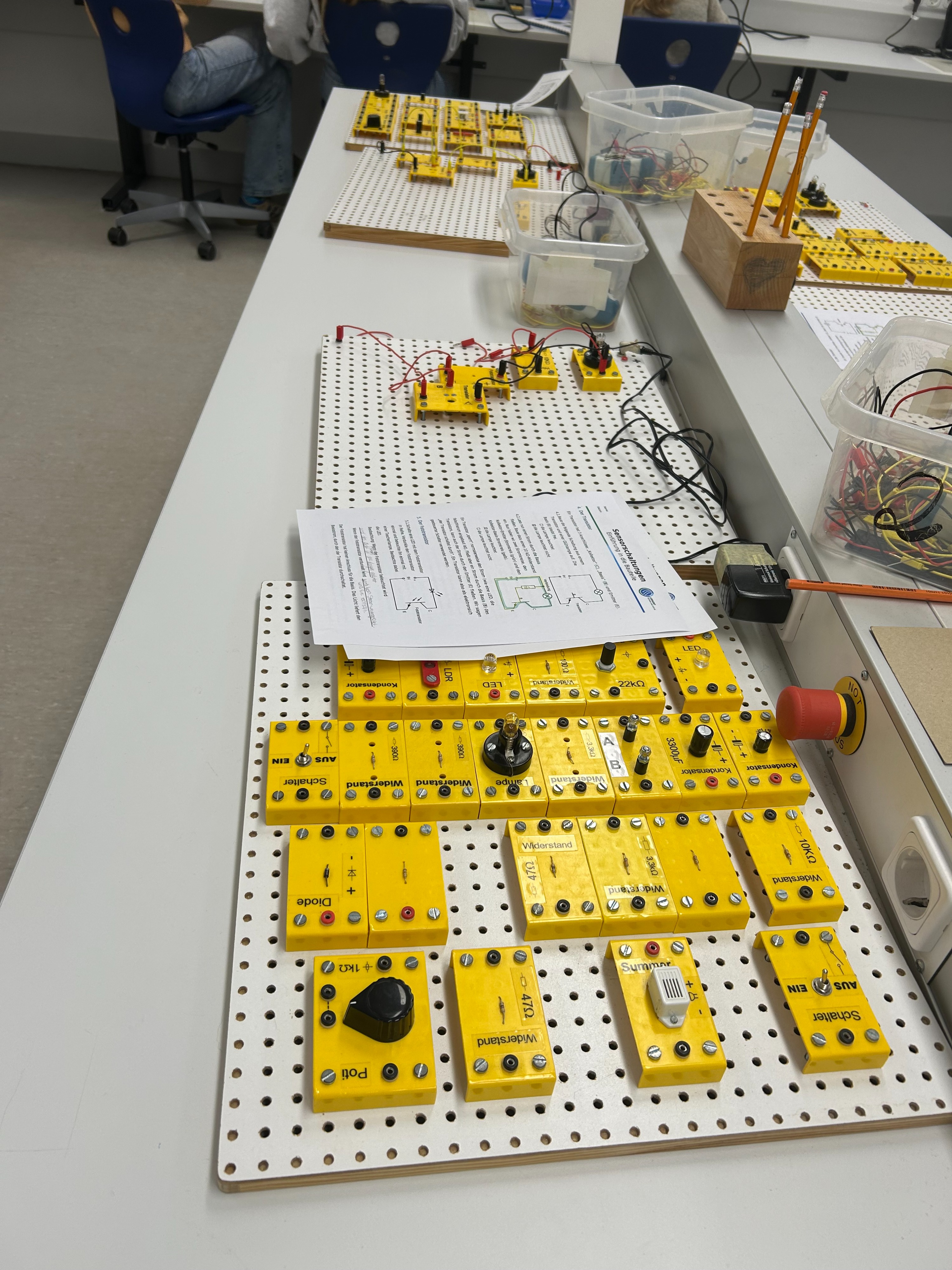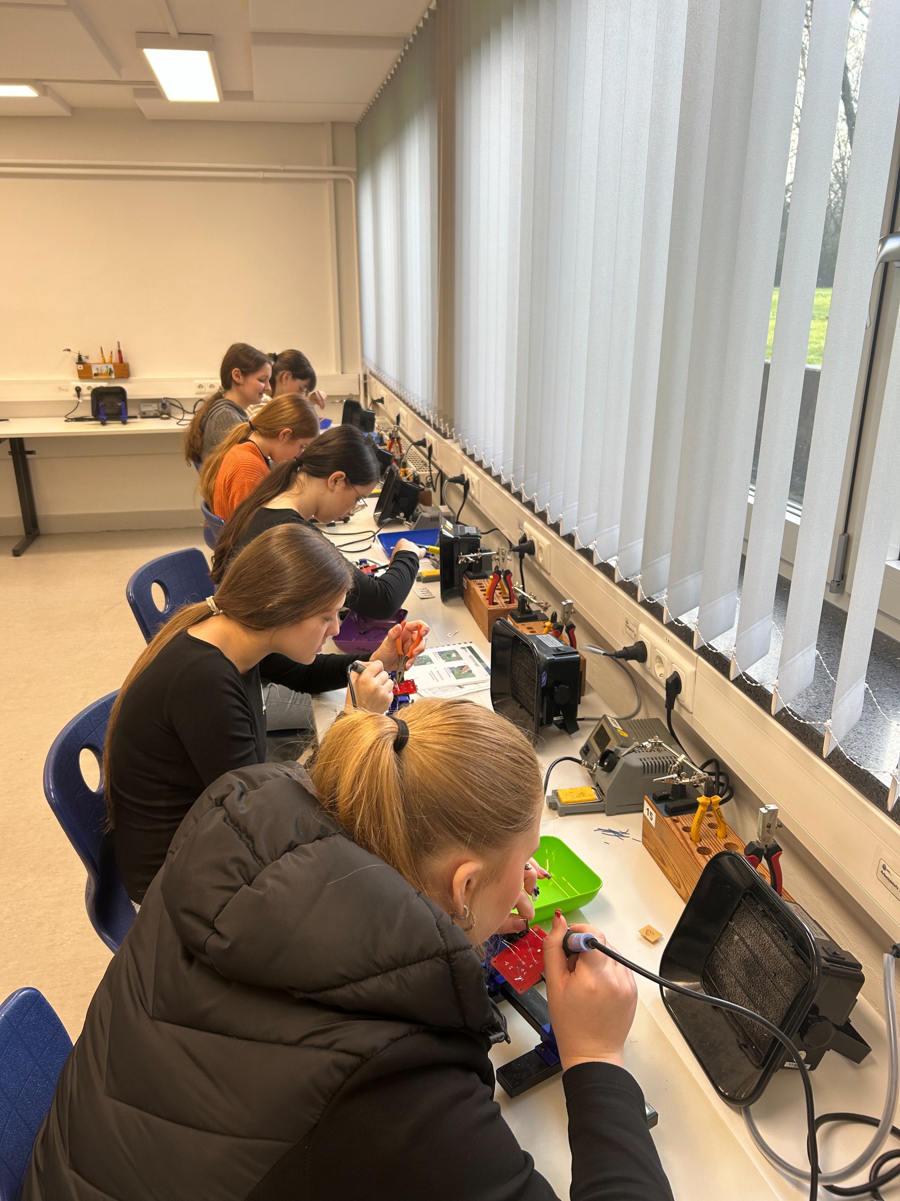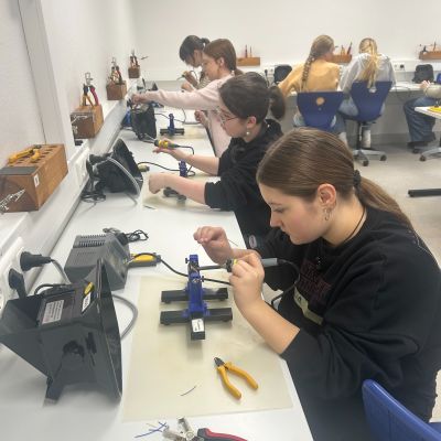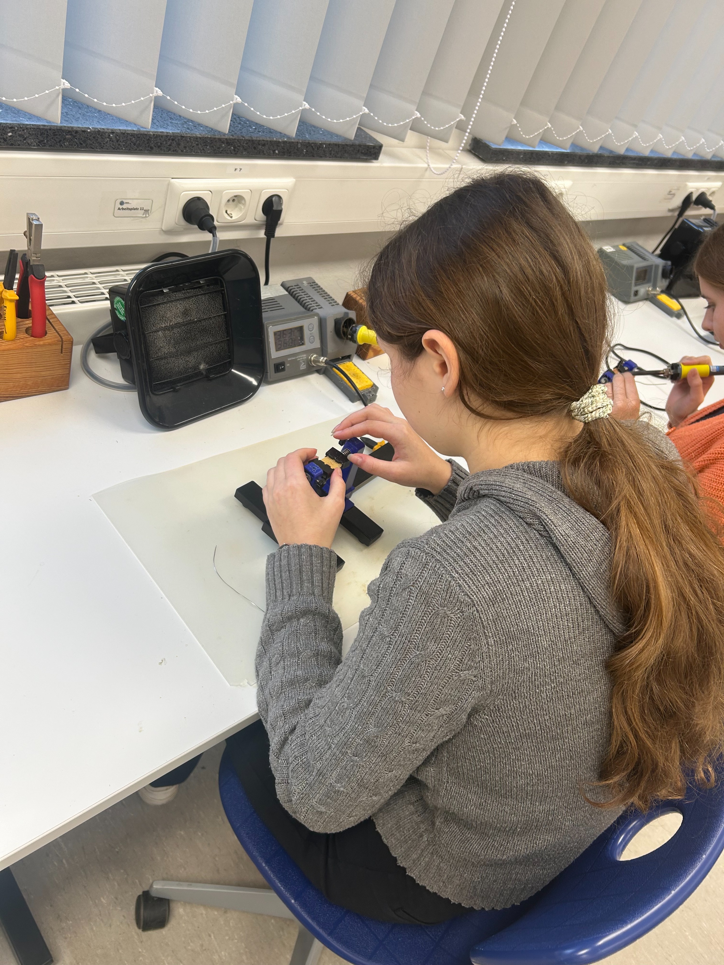 Am ersten Projekttag nahmen die Jugendlichen am Modul „Sensorschaltungen“ teil, einem Einstiegskurs in den Bereich Elektronik. Im Kontext eines „Smart Homes“ lernten sie grundlegende elektronische Bauteile kennen, insbesondere den Transistor als zentrales Element moderner Sensoren. In Partnerarbeit experimentierten sie mit verschiedenen Schaltungen, lasen Schaltpläne, sammelten erste Erfahrungen im Löten und fertigten eigenständig eine Sensorschaltung – etwa ein Nachtlicht oder eine Alarmanlage. Dabei konnten sie ihr Wissen über Stromkreise, Knotenregel und einfache Schaltungen praktisch anwenden und vertiefen.