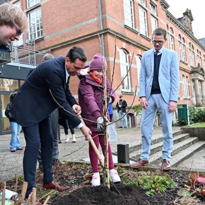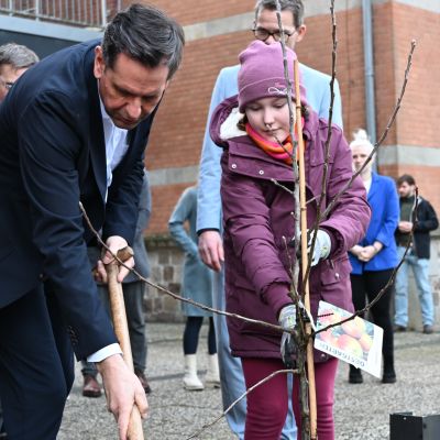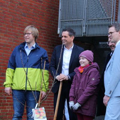 Bei seiner Ankunft wurde er vom Schulleiter Jürgen Ploeger-Lobeck und unserer Stellvertretenden Schulleiterin Kati Finke empfangen. Kurz nach der Ankunft hieß Gerald Kühn, Leiter der Nature-Ninjas-AG, den Minister willkommen und es wurde gemeinsam ein Baum gepflanzt.