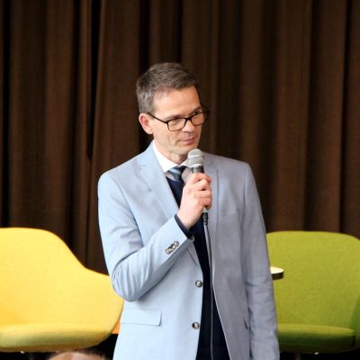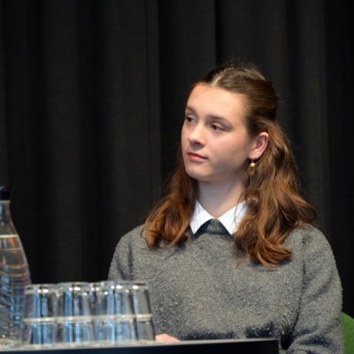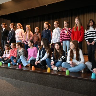 Um 9.50 Uhr folgte in der Aula die offizielle Begrüßung durch die Lehrkräfte, die die Podiumsdiskussion vorbereitet hatten: Marie Hoheisel (kommissarische Fachobfrau), Stephanie Gruhle und Ralf Boës. Als weitere Gäste waren Landrat Sven Ambrosy sowie die zuständige schulfachliche Dezernentin Frau LRSD’ Kletzin eingeladen. Für den musikalischen Auftakt sorgte der Schulchor „mg-voices“ unter der Leitung von Frau Harland.