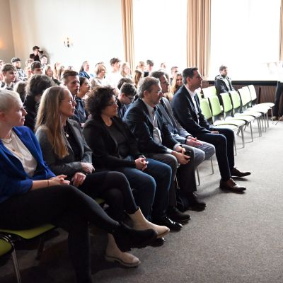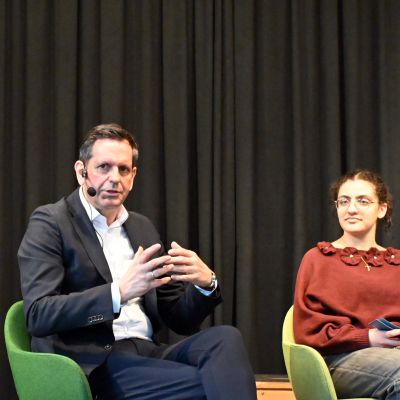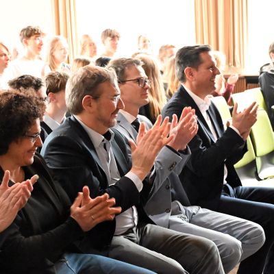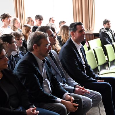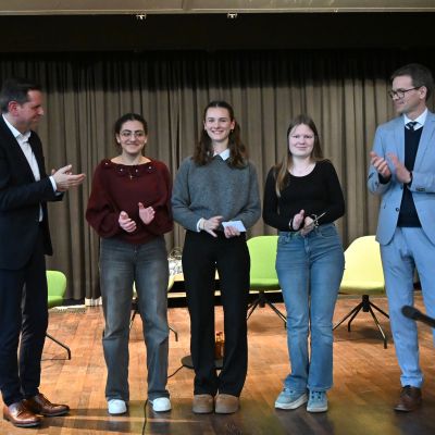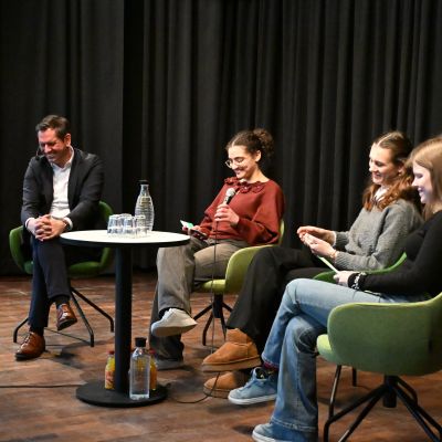 Anschließend diskutierte Olaf Lies mit Schülerinnen und Schülern der Jahrgänge 12 und 13. Die Moderation übernahmen Miren Rizk (Jg. 12) sowie Annika Harms und Vivian Schmöckel (beide Jg. 13). Im Vorfeld waren Fragen digital gesammelt und bewertet worden. Inhaltlich ging es unter anderem um den Atomausstieg, die Energiewende, das 49-Euro-Deutschlandticket sowie Herausforderungen im öffentlichen Nahverkehr.