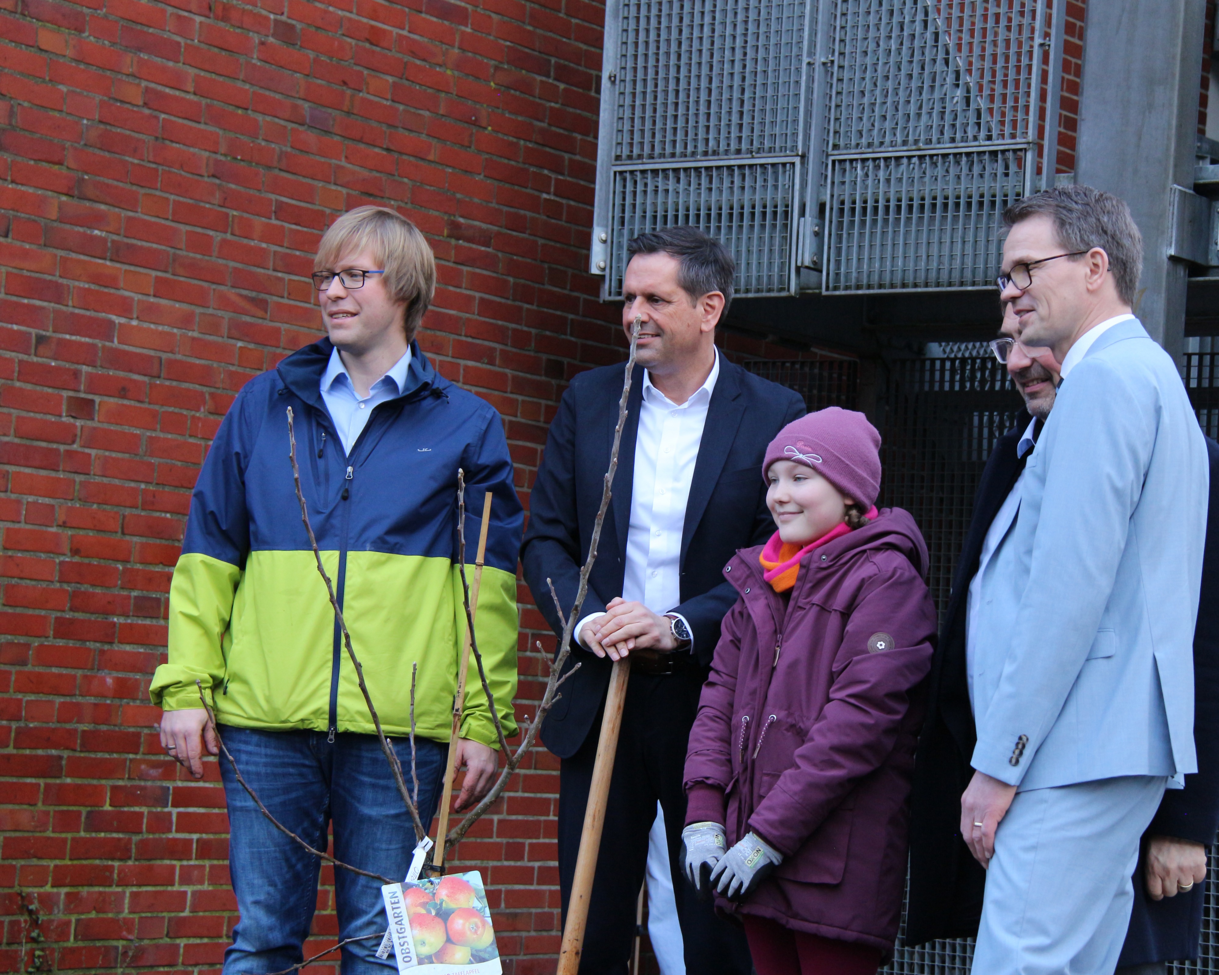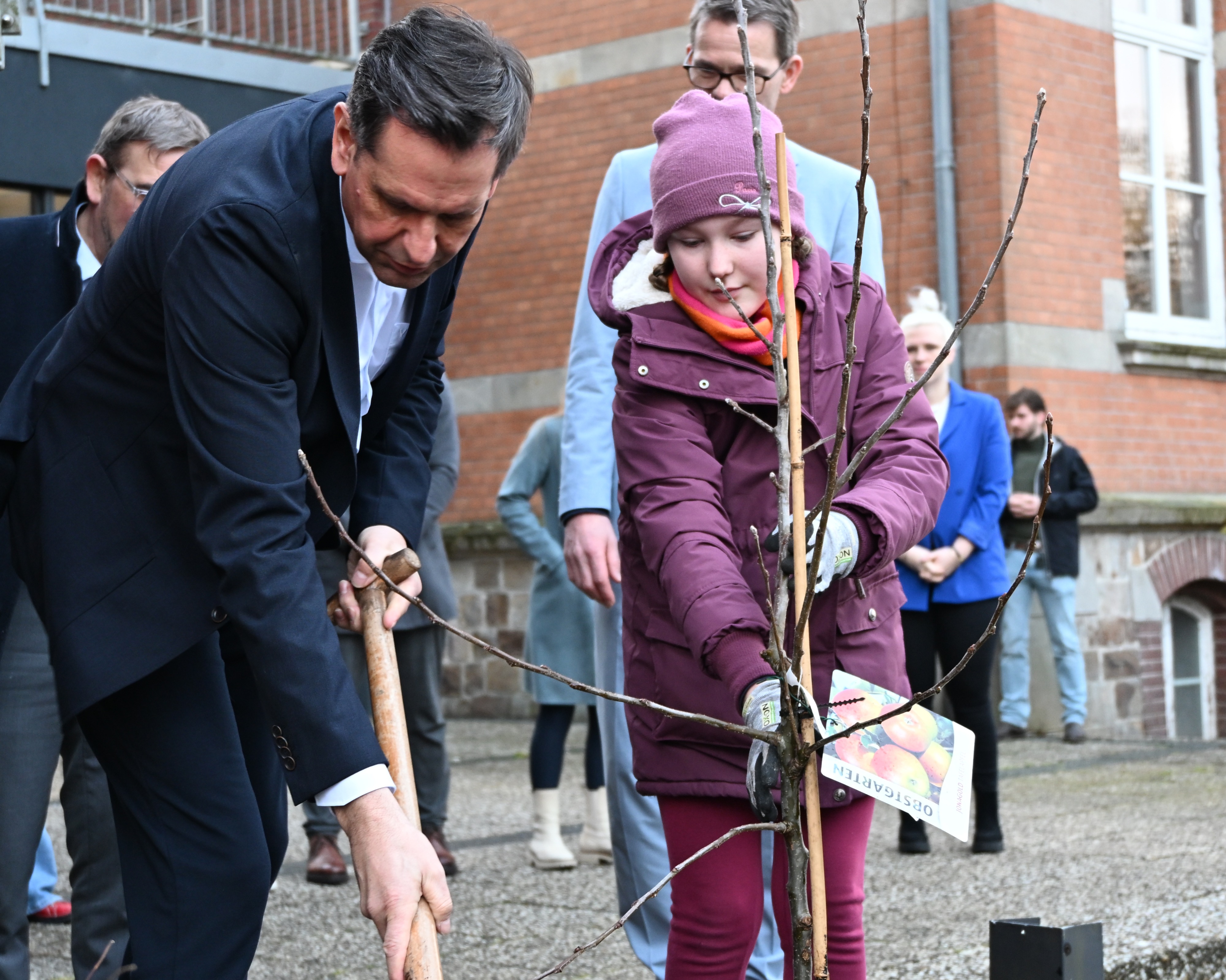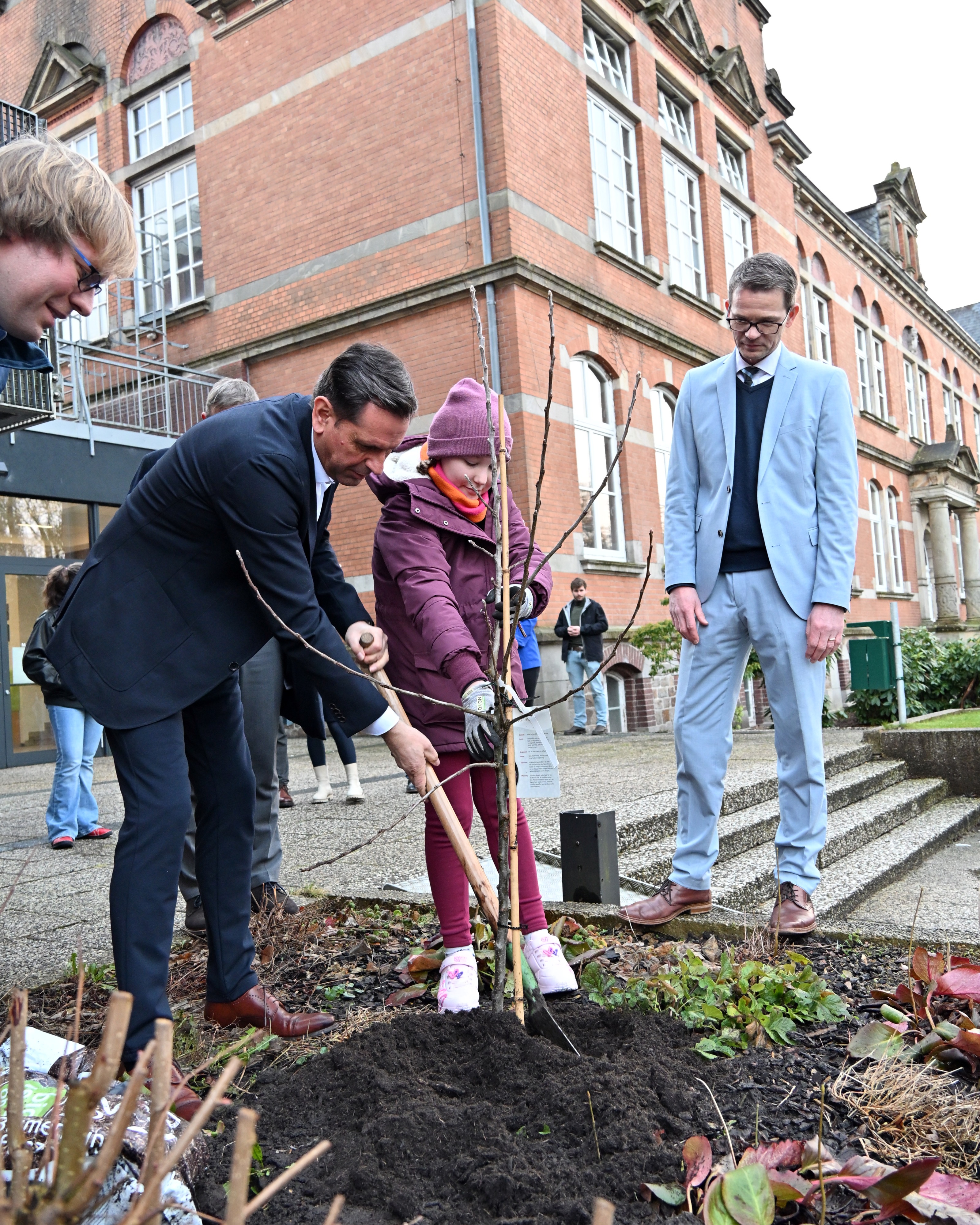 Bei seiner Ankunft wurde er vom Schulleiter Jürgen Ploeger-Lobeck und unserer Stellvertretenden Schulleiterin Kati Finke empfangen. Kurz nach der Ankunft hieß Gerald Kühn, Leiter der Nature-Ninjas-AG, den Minister willkommen und es wurde gemeinsam ein Baum gepflanzt.