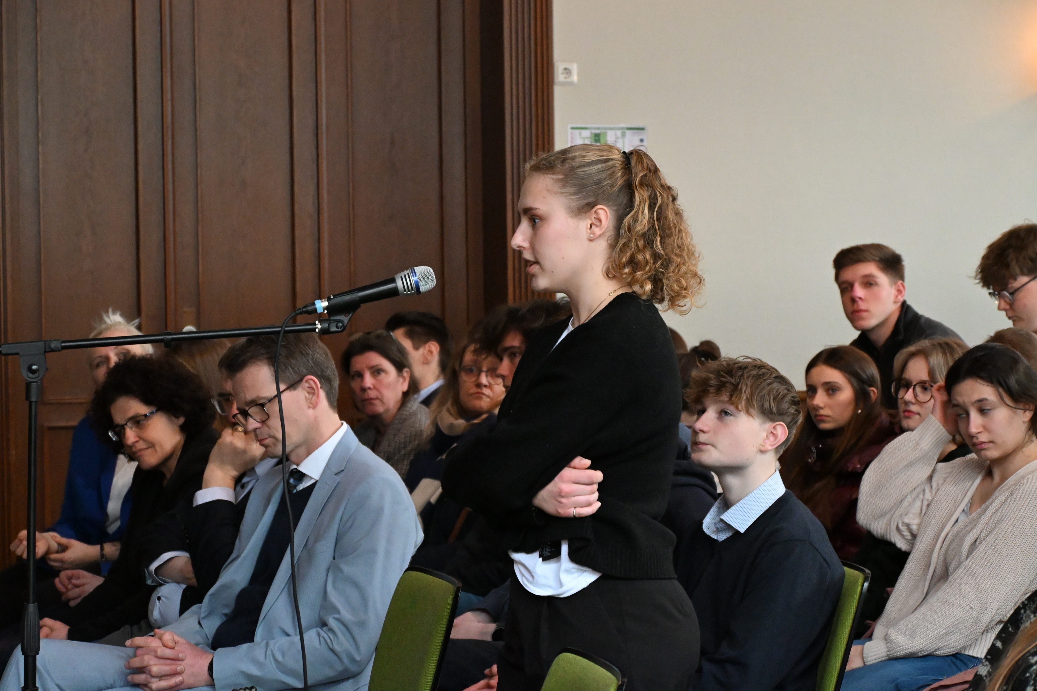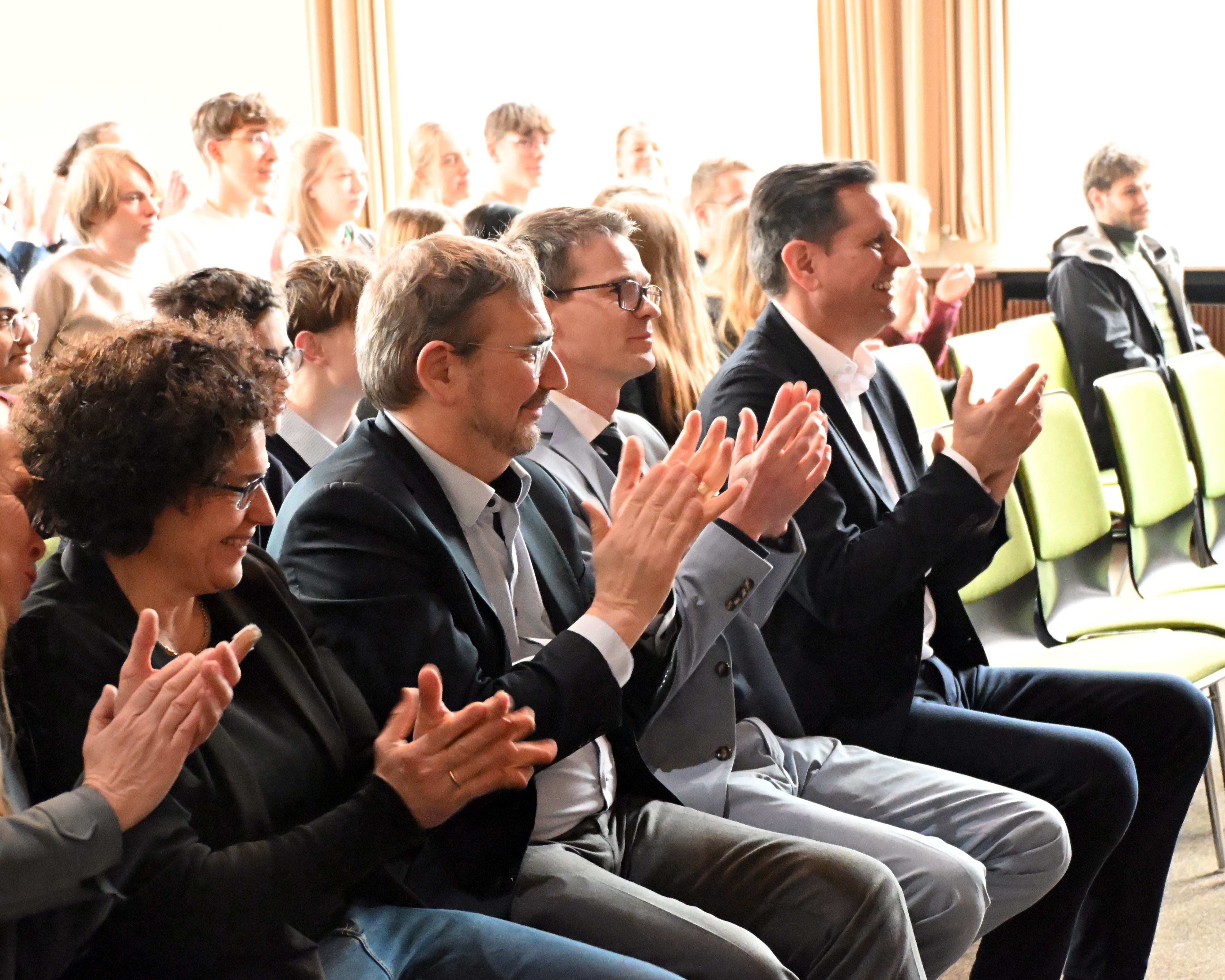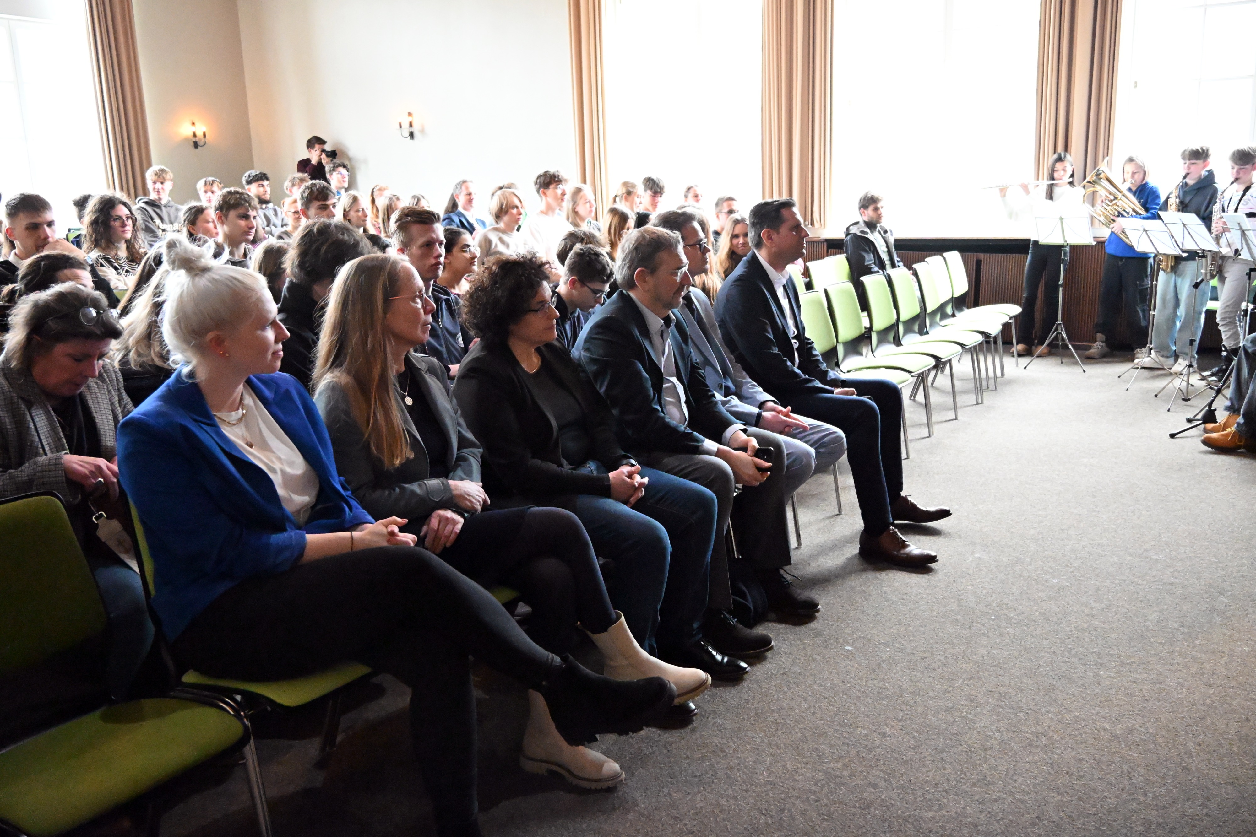 Um 9.50 Uhr folgte in der Aula die offizielle Begrüßung durch die Lehrkräfte, die die Podiumsdiskussion vorbereitet hatten: Marie Hoheisel (kommissarische Fachobfrau), Stephanie Gruhle und Ralf Boës. Als weitere Gäste waren Landrat Sven Ambrosy sowie die zuständige schulfachliche Dezernentin Frau LRSD’ Kletzin eingeladen. Für den musikalischen Auftakt sorgte der Schulchor „mg-voices“ unter der Leitung von Frau Harland.