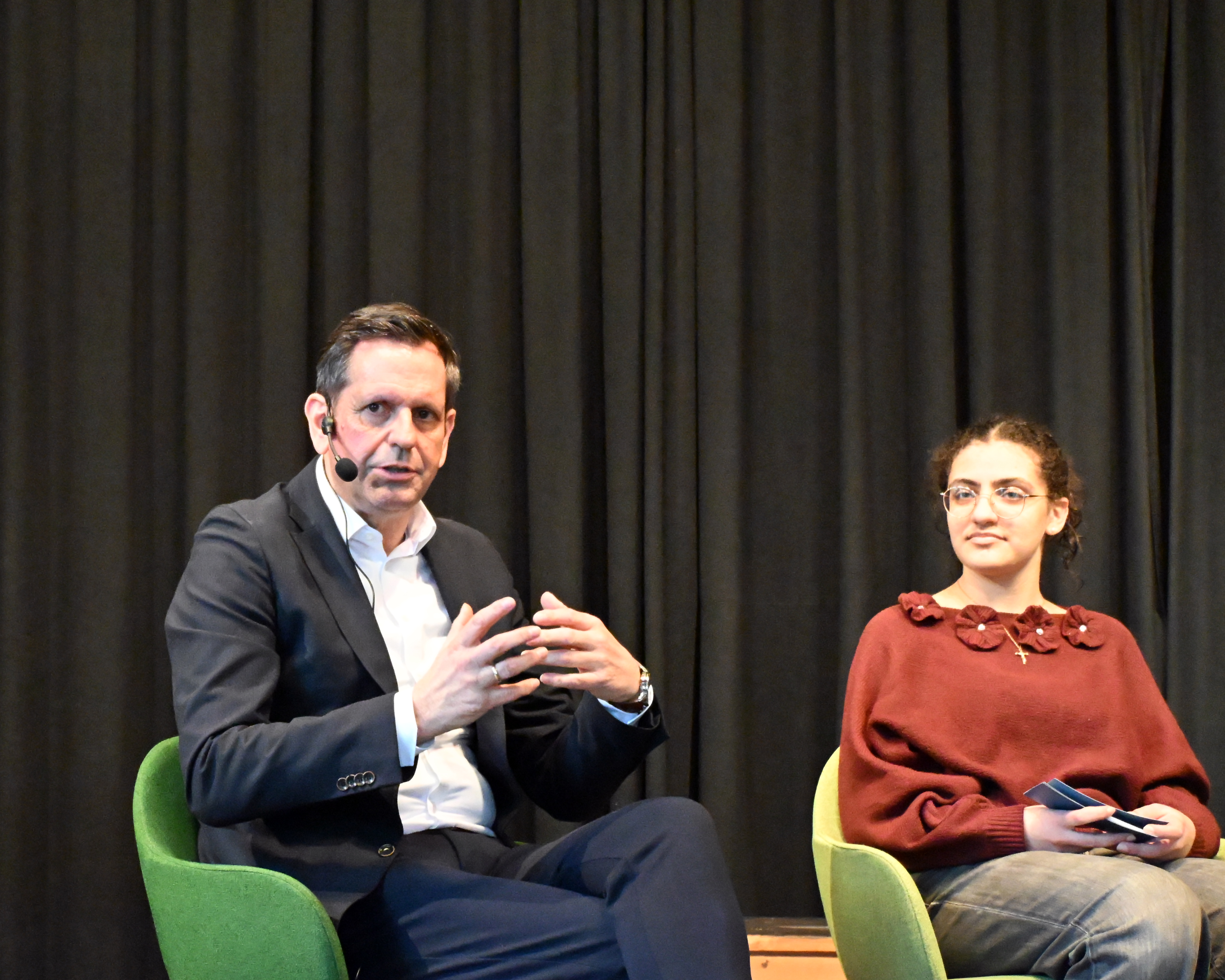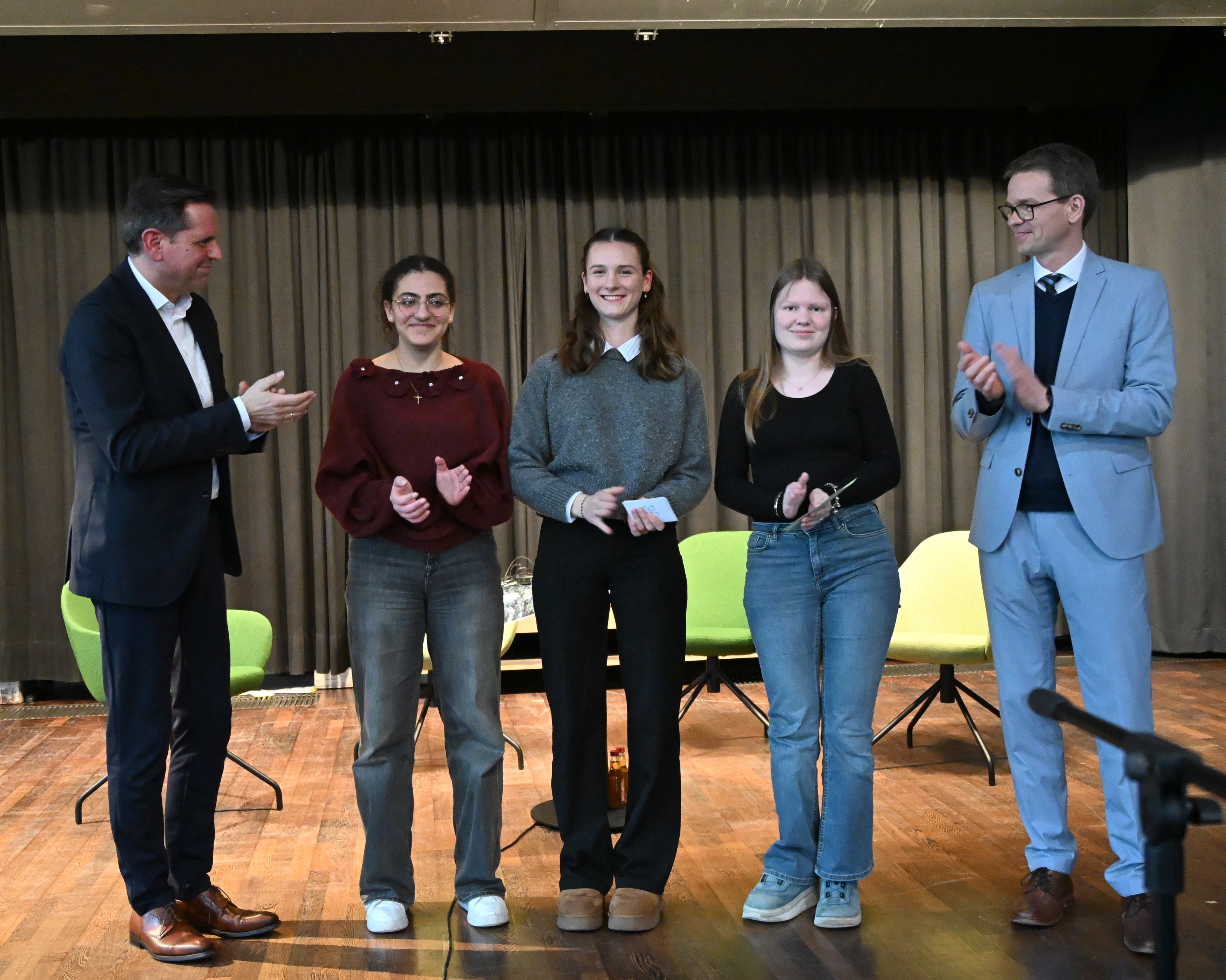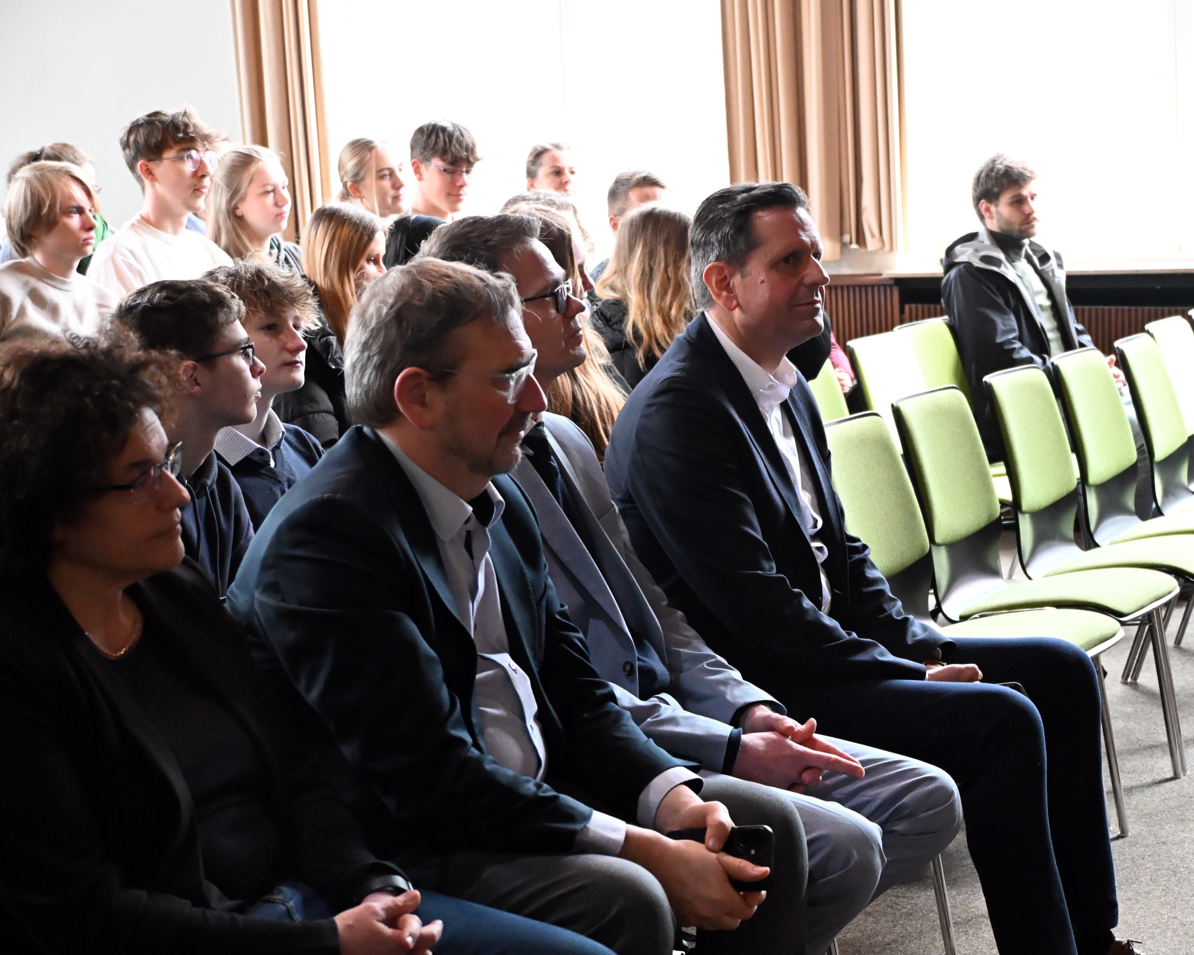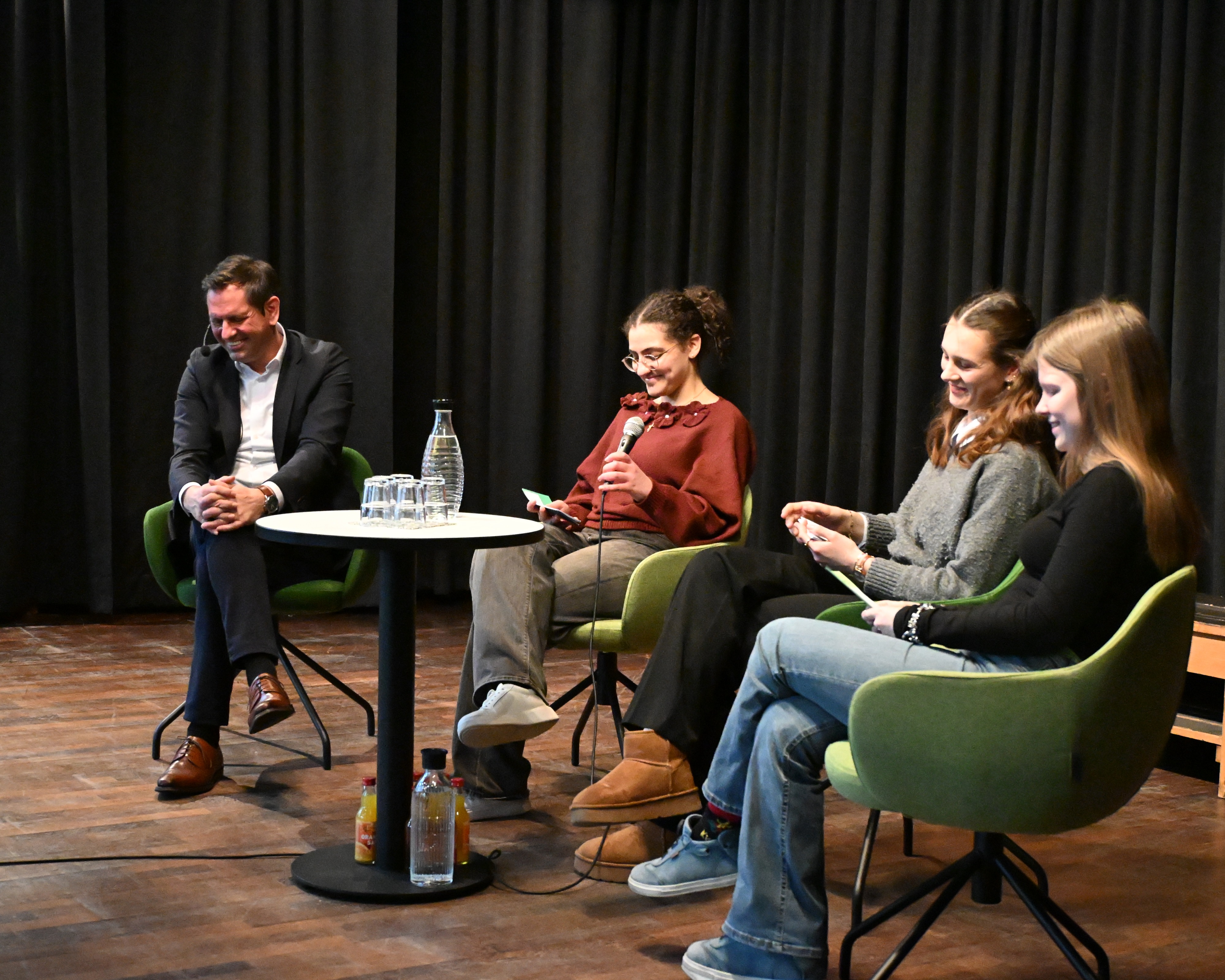 Anschließend diskutierte Olaf Lies mit Schülerinnen und Schülern der Jahrgänge 12 und 13. Die Moderation übernahmen Miren Rizk (Jg. 12) sowie Annika Harms und Vivian Schmöckel (beide Jg. 13). Im Vorfeld waren Fragen digital gesammelt und bewertet worden. Inhaltlich ging es unter anderem um den Atomausstieg, die Energiewende, das 49-Euro-Deutschlandticket sowie Herausforderungen im öffentlichen Nahverkehr.