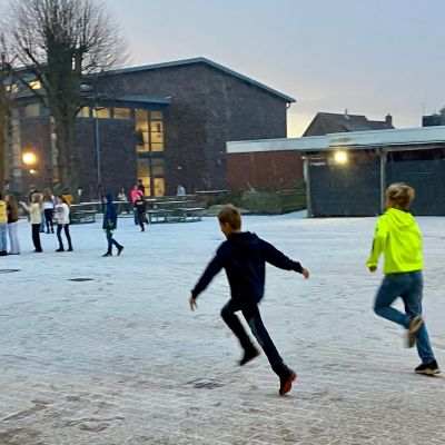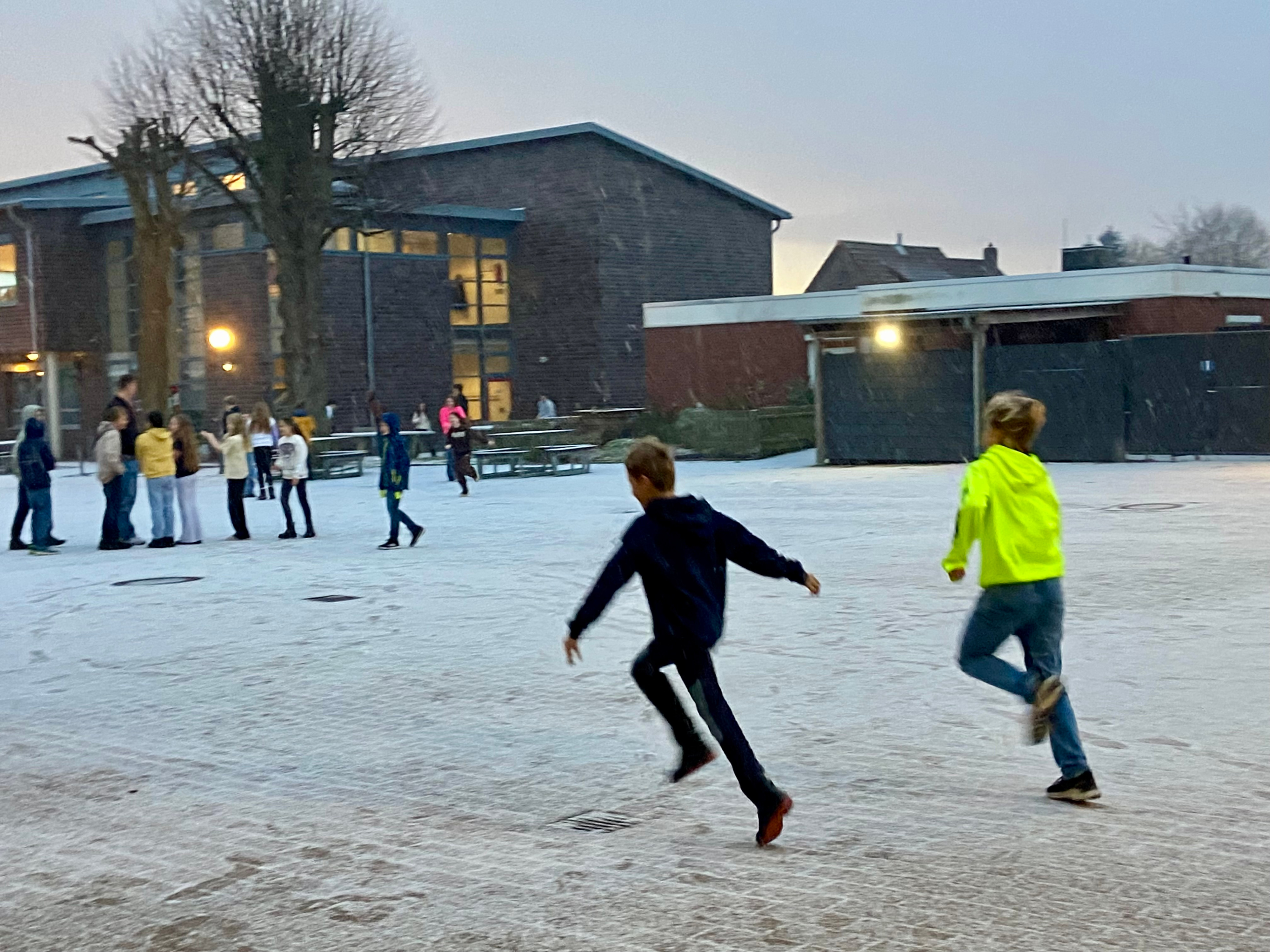 Als die Pause begann, stürmten die Kinder hinaus. Ihre Rufe und ihr Lachen erfüllten den Hof, während sie Schneehügel bauten und Muster in den glitzernden Boden zeichneten. Die Lehrer lächelten – die Schule war für einen Moment eine kleine Winterwelt.