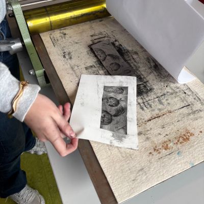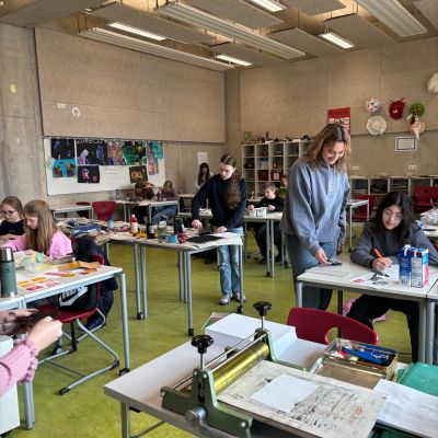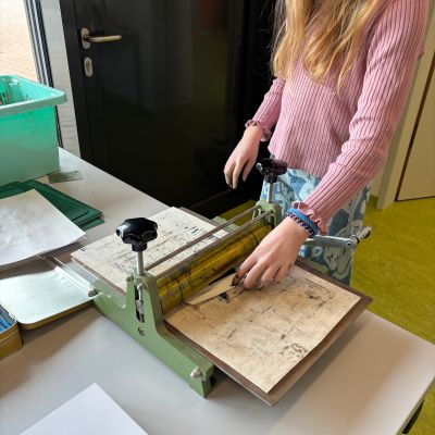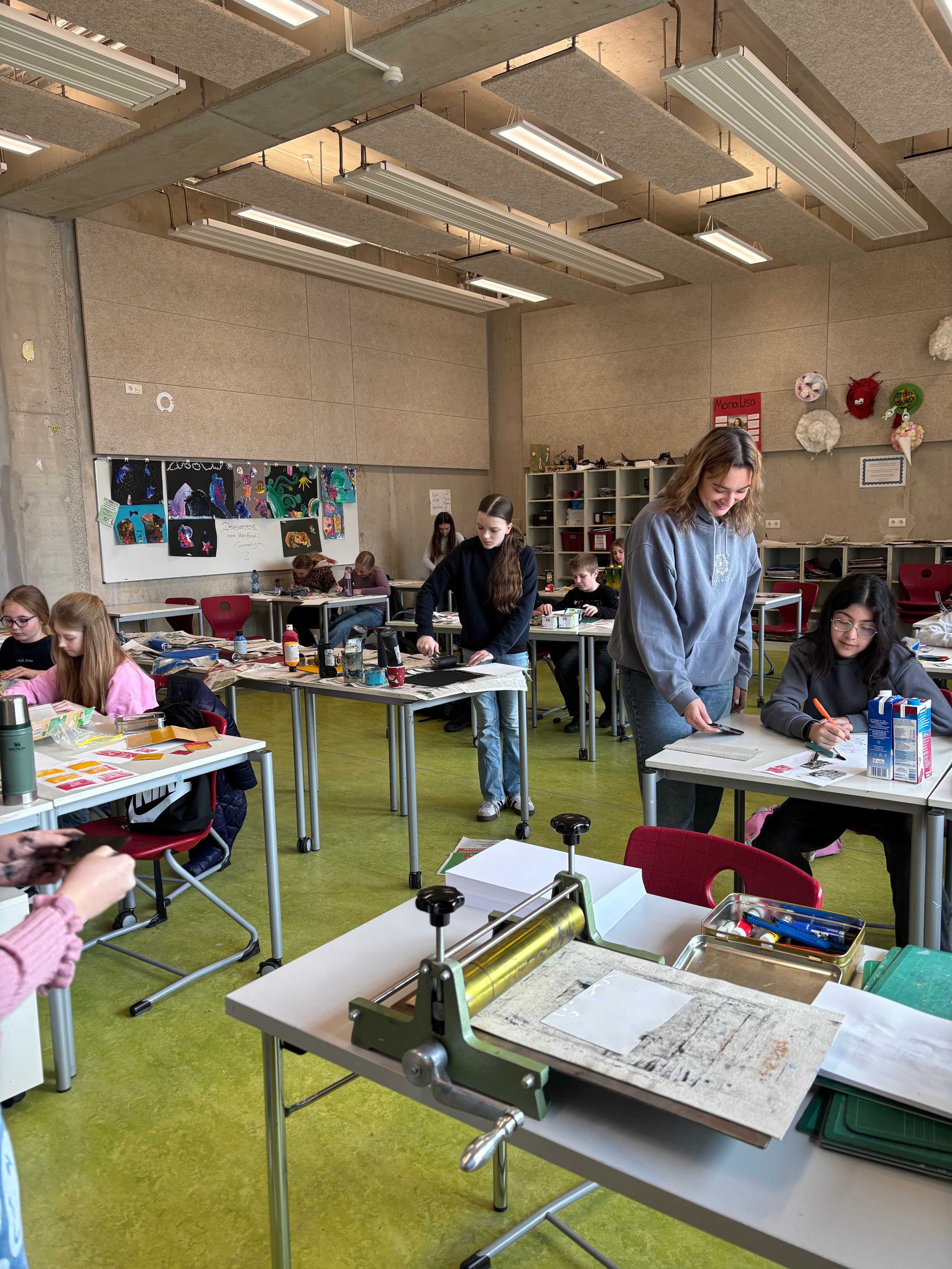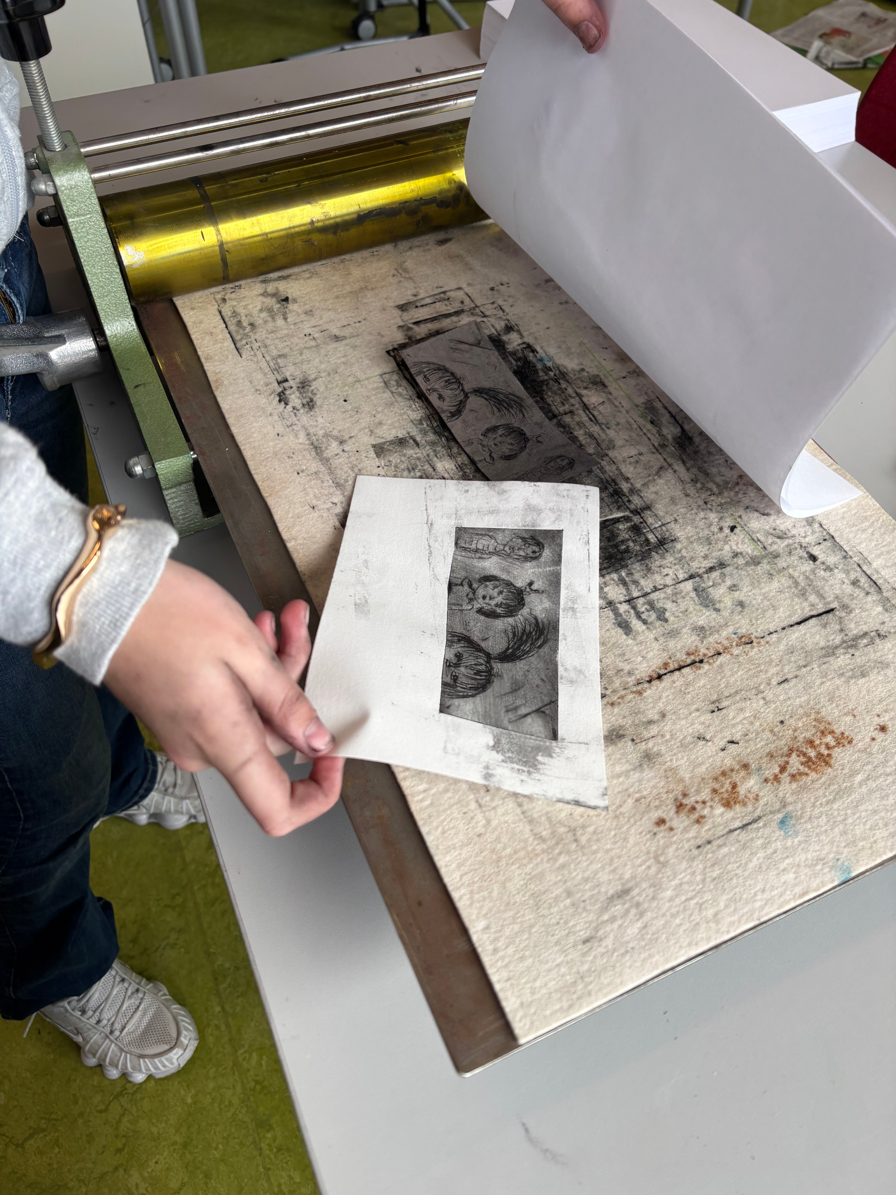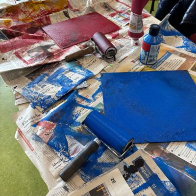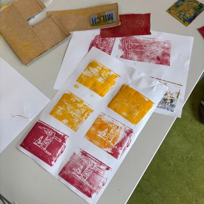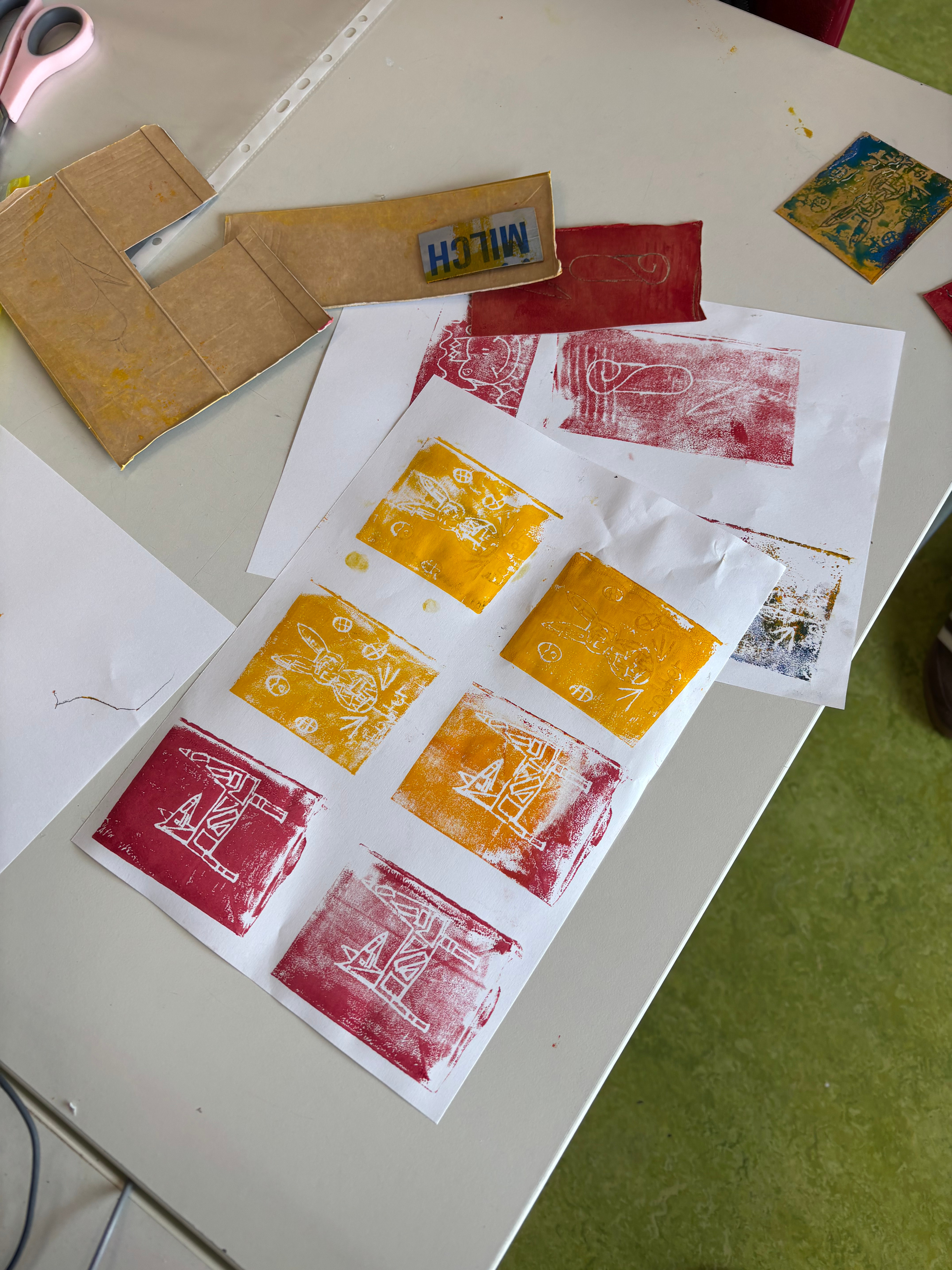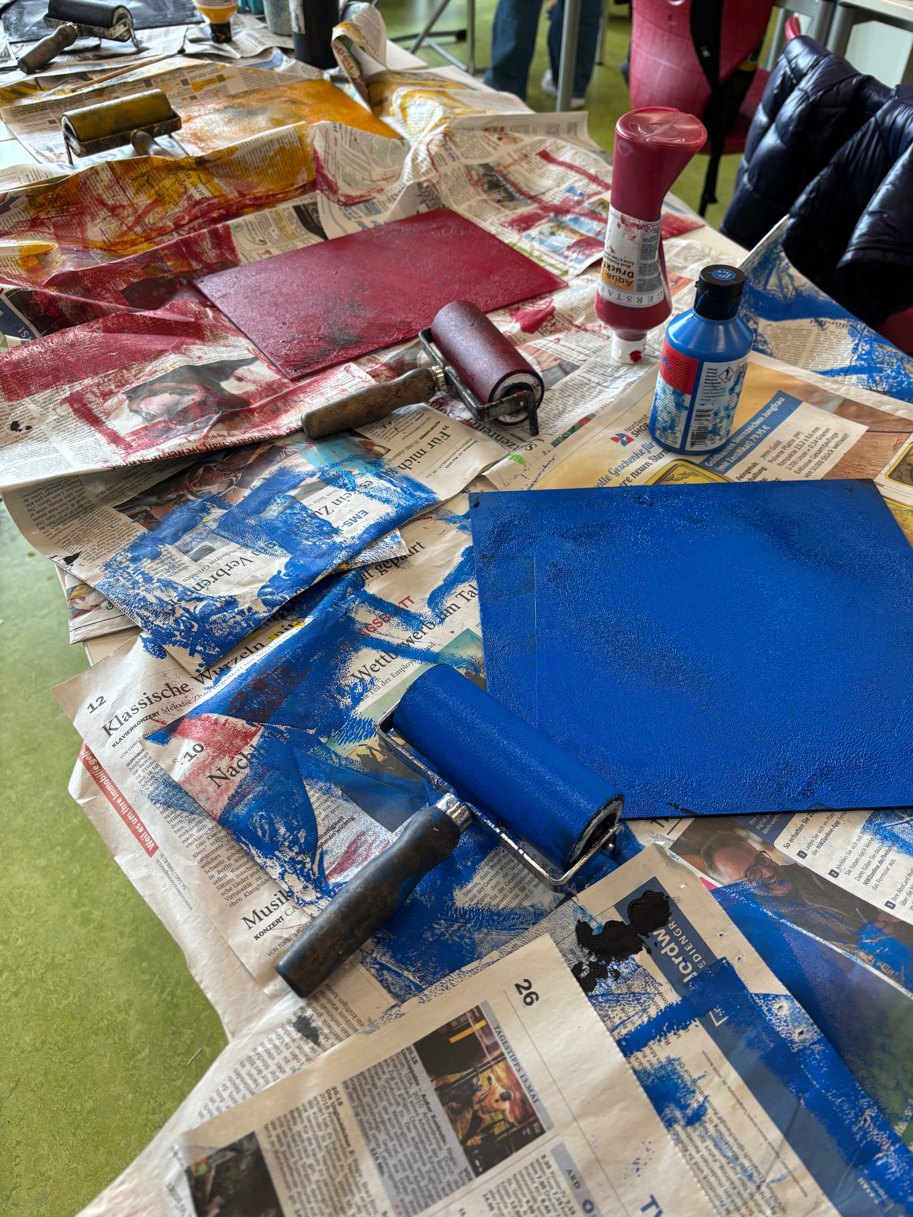 Am ersten Tag besuchten wir die Druckwerkstatt und das sogenannte Keyboardbuffet. In der Druckwerkstatt gestalteten wir eigene Druckvorlagen, indem wir mit einem Kugelschreiber Motive spiegelverkehrt in Milchkartons ritzten. Diese wurden anschließend eingefärbt und auf Papier gedruckt – so entstanden individuelle Kunstwerke.