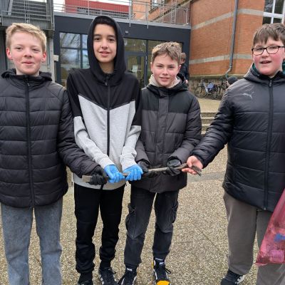 Am 14.03.2025 hat die Klasse 7 d im Rahmen der Frühjahrsputzaktion der Stadt Jever im Innenstadtbereich einen ganzen Haufen Müll aufgesammelt. Die skurrilsten Fundstücke waren eine Radkappe, eine Fußmatte und ein Brecheisen.