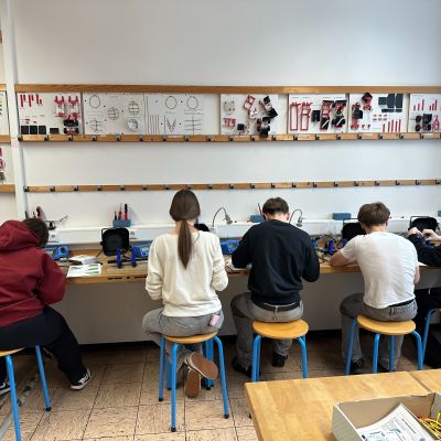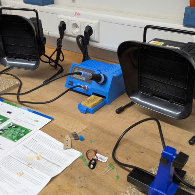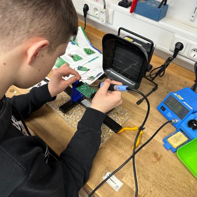 Anschließend bestückten die Schülerinnen und Schüler selbstständig eine Platine und löteten ihre eigene funktionierende Blinkschaltung. Dabei standen der sachgerechte Umgang mit Werkzeugen und Materialien sowie sicheres Arbeiten mit elektrischen Bauteilen im Vordergrund.